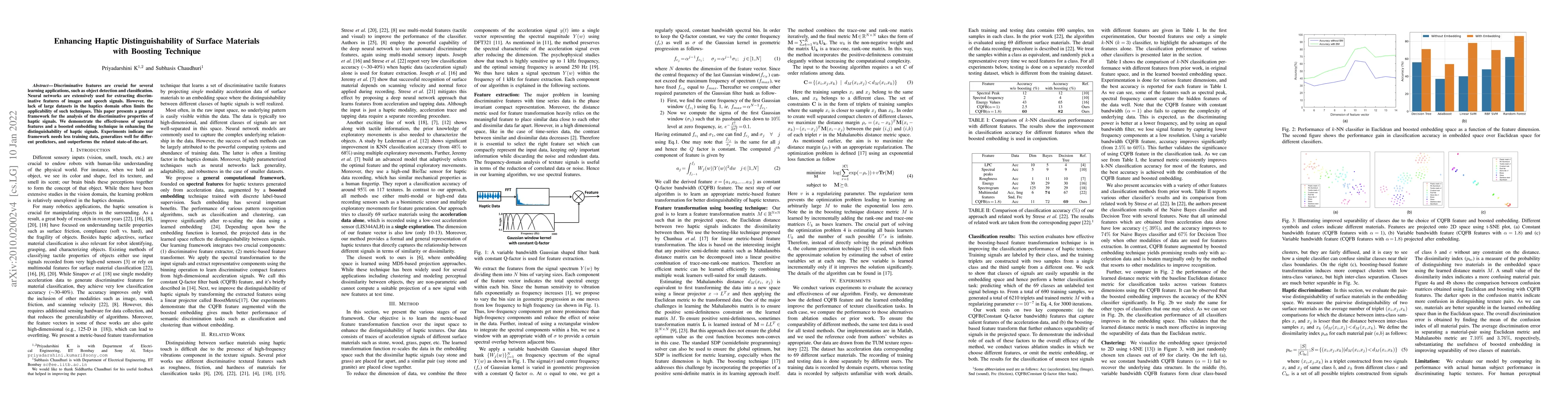 Discriminative features are crucial for several learning applications, such as object detection and classification. Neural networks are extensively used for extracting discriminative features of images and speech signals. However, the lack of large datasets in the haptics domain often limits the applicability of such techniques. This paper presents a general framework for the analysis of the discriminative properties of haptic signals. We demonstrate the effectiveness of spectral features and a boosted embedding technique in enhancing the distinguishability of haptic signals. Experiments indicate our framework needs less training data, generalizes well for different predictors, and outperforms the related state-of-the-art.