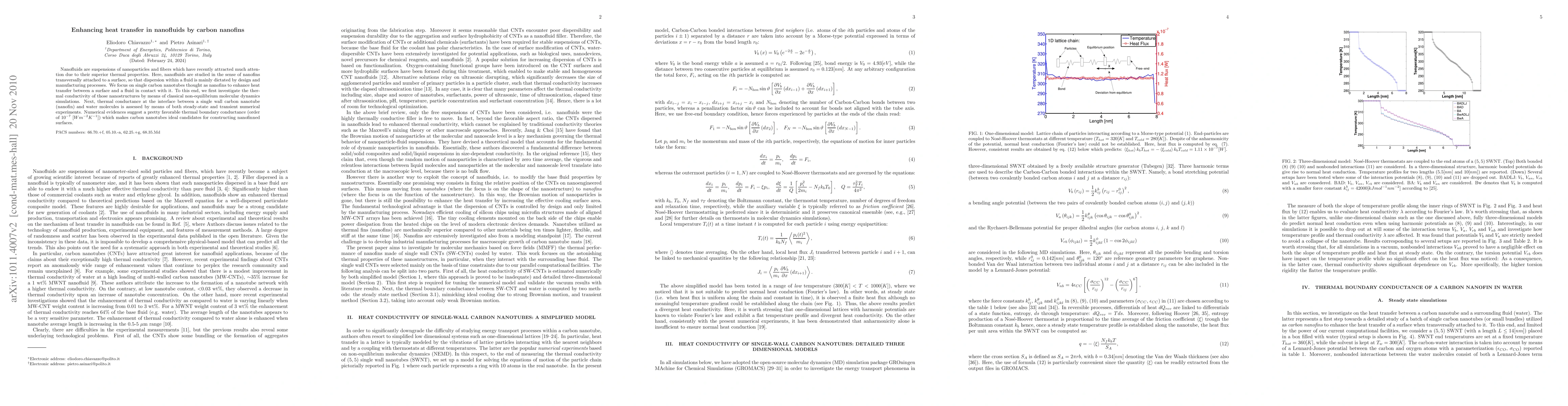 Nanofluids are suspensions of nanoparticles and fibers which have recently attracted much attention due to their superior thermal properties. Here, nanofluids are studied in the sense of nanofins transversally attached to a surface, so that dispersion within a fluid is mainly dictated by design and manufacturing processes. We focus on single carbon nanotubes thought as nanofins to enhance heat transfer between a surface and a fluid in contact with it. To this end, we first investigate the thermal conductivity of those nanostructures by means of classical non-equilibrium molecular dynamics simulations. Next, thermal conductance at the interface between a single wall carbon nanotube (nanofin) and water molecules is assessed by means of both steady-state and transient numerical experiments. Numerical evidences suggest a pretty favorable thermal boundary conductance (order of $10^{-7}$ $[W m^{-2} K^{-1}]$) which makes carbon nanotubes ideal candidates for constructing nanofinned surfaces.