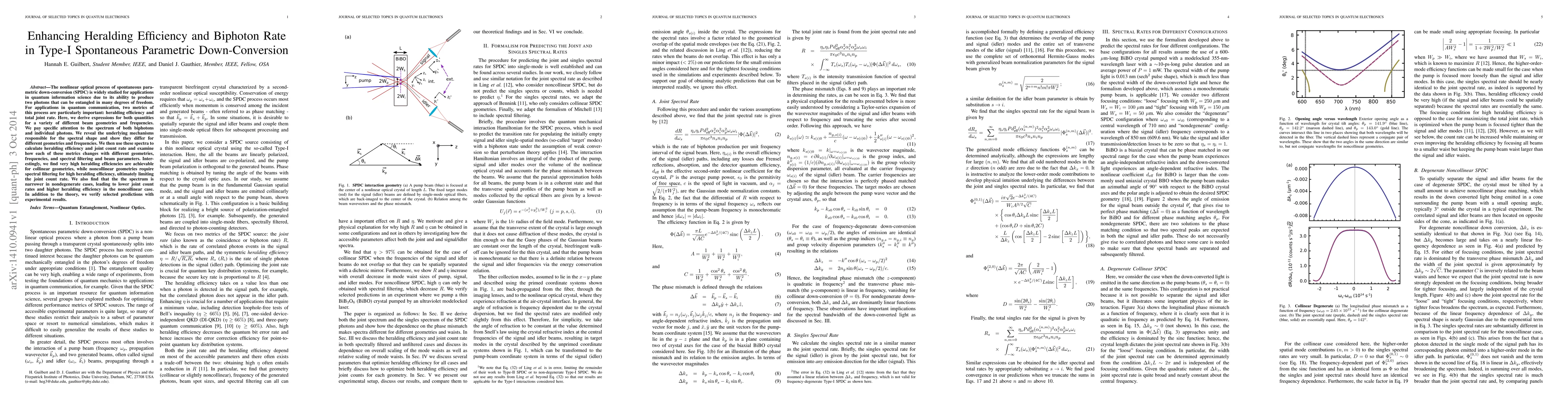 This research derives expressions for heralding efficiency and biphoton rate in Type-I SPDC, revealing that collinear geometries achieve high heralding efficiency without filtering, while noncollinear geometries need filtering, reducing joint count rate. Experimental results support these findings, highlighting the importance of geometry and filtering in SPDC applications.