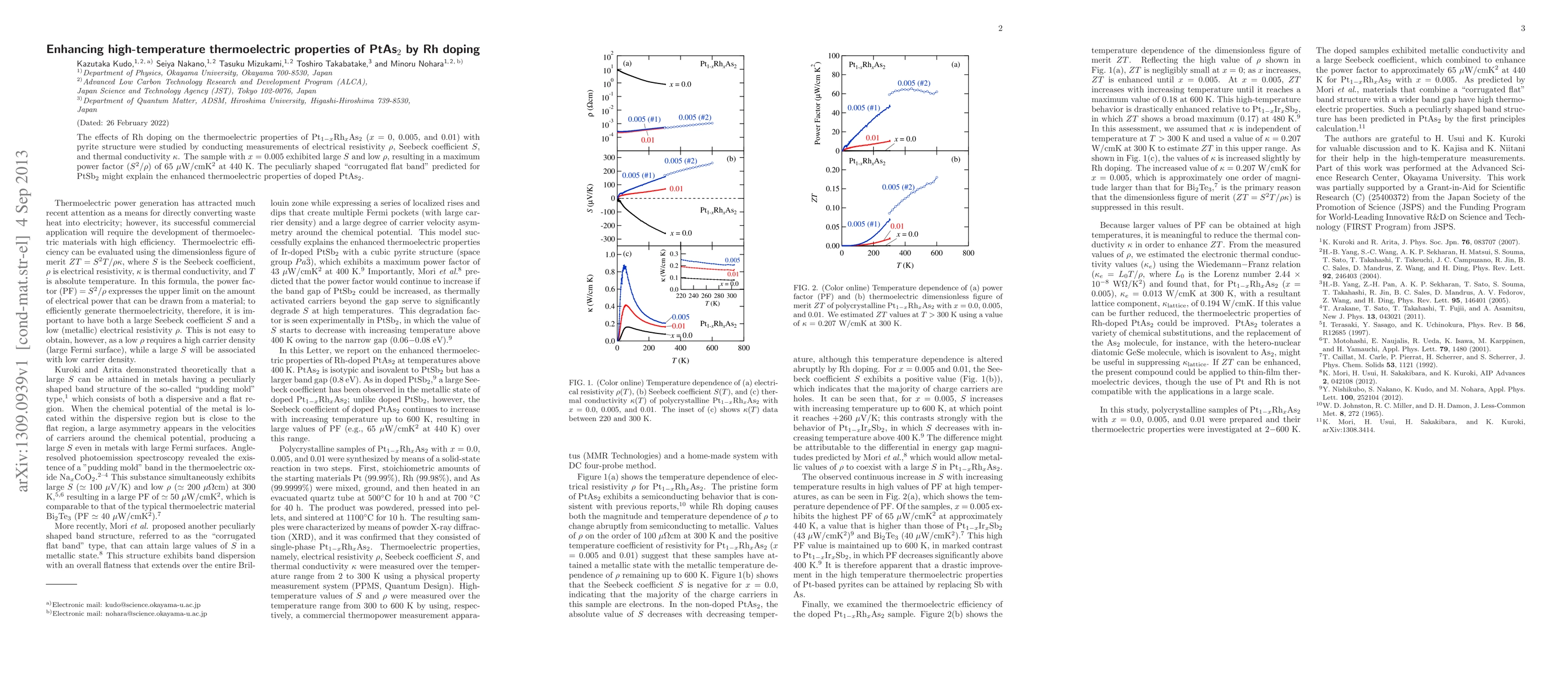 The research investigates Rh doping in PtAs2, enhancing its thermoelectric properties at high temperatures. The optimal doping level (x = 0.005) led to a maximum power factor and low thermal conductivity, attributed to a predicted 'corrugated flat band' structure.