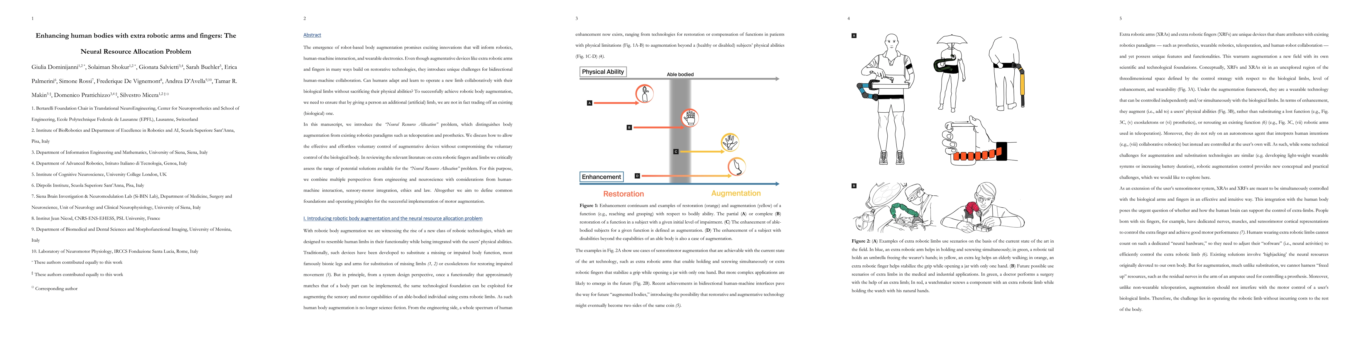 The emergence of robot-based body augmentation promises exciting innovations that will inform robotics, human-machine interaction, and wearable electronics. Even though augmentative devices like extra robotic arms and fingers in many ways build on restorative technologies, they introduce unique challenges for bidirectional human-machine collaboration. Can humans adapt and learn to operate a new limb collaboratively with their biological limbs without sacrificing their physical abilities? To successfully achieve robotic body augmentation, we need to ensure that by giving a person an additional (artificial) limb, we are not in fact trading off an existing (biological) one. In this manuscript, we introduce the "Neural Resource Allocation" problem, which distinguishes body augmentation from existing robotics paradigms such as teleoperation and prosthetics. We discuss how to allow the effective and effortless voluntary control of augmentative devices without compromising the voluntary control of the biological body. In reviewing the relevant literature on extra robotic fingers and limbs we critically assess the range of potential solutions available for the "Neural Resource Allocation" problem. For this purpose, we combine multiple perspectives from engineering and neuroscience with considerations from human-machine interaction, sensory-motor integration, ethics and law. Altogether we aim to define common foundations and operating principles for the successful implementation of motor augmentation.