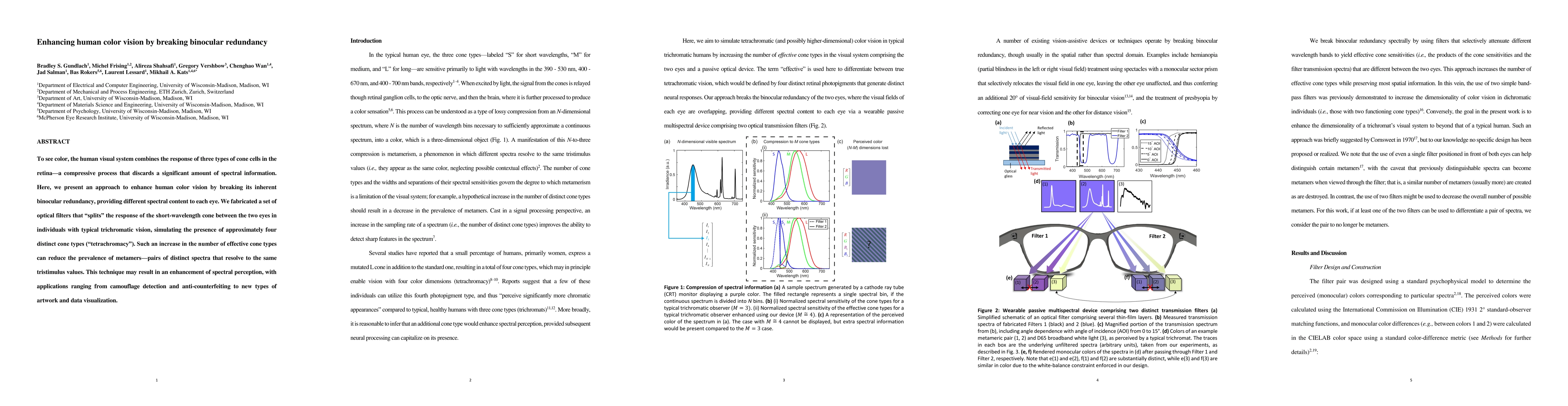 To see color, the human visual system combines the response of three types of cone cells in the retina--a compressive process that discards a significant amount of spectral information. Here, we present an approach to enhance human color vision by breaking its inherent binocular redundancy, providing different spectral content to each eye. We fabricated a set of optical filters that "splits" the response of the short-wavelength cone between the two eyes in individuals with typical trichromatic vision, simulating the presence of approximately four distinct cone types ("tetrachromacy"). Such an increase in the number of effective cone types can reduce the prevalence of metamers--pairs of distinct spectra that resolve to the same tristimulus values. This technique may result in an enhancement of spectral perception, with applications ranging from camouflage detection and anti-counterfeiting to new types of artwork and data visualization.