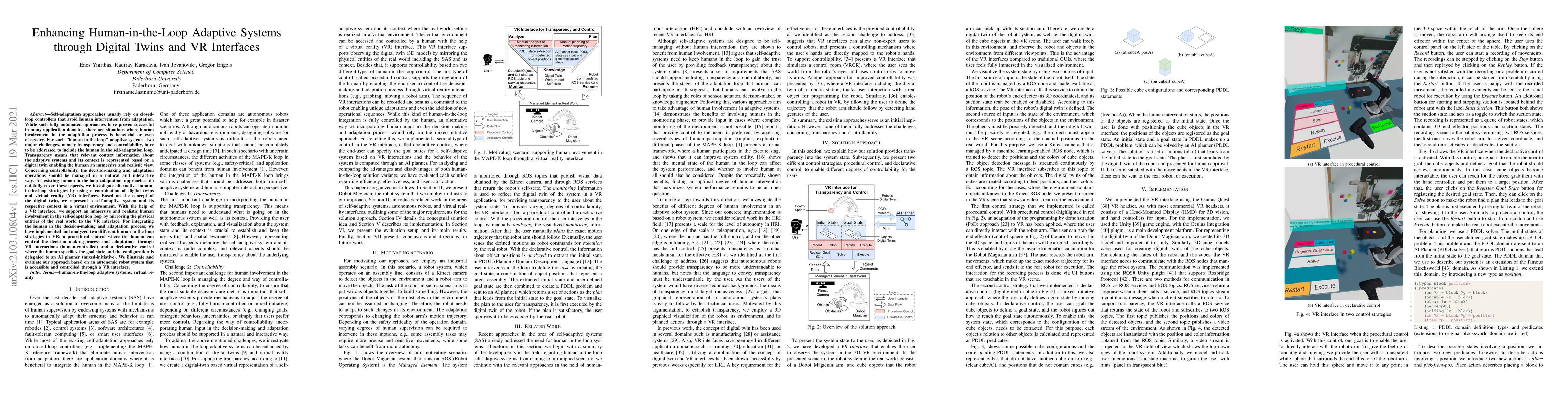 This paper explores enhancing human-in-the-loop adaptive systems using digital twins and VR interfaces to address transparency and controllability challenges. It proposes two strategies: human-controlled procedural and mixed-initiative declarative, evaluated through an autonomic robot system in a VR environment.