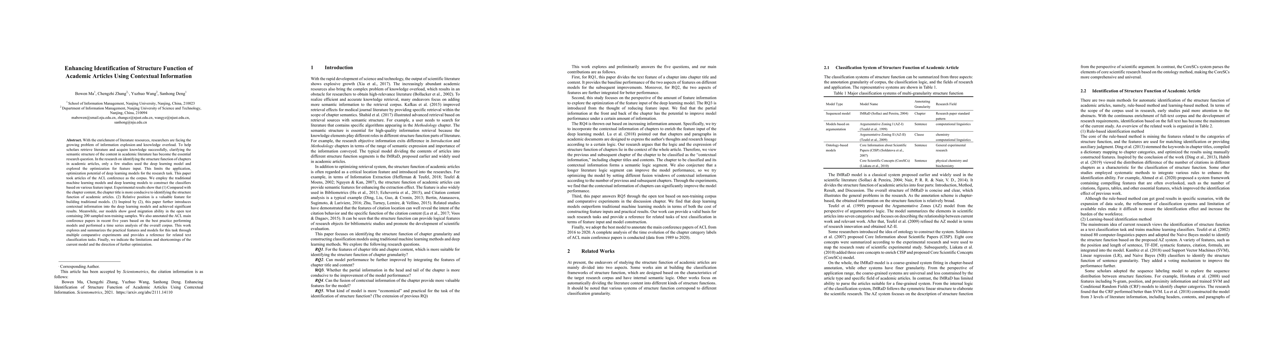 This paper investigates the use of contextual information and various feature inputs to enhance the identification of structure functions in academic articles, demonstrating that chapter titles and contextual information significantly improve deep learning model performance. The study also highlights the migration ability of the models and provides a reference for future text classification tasks.