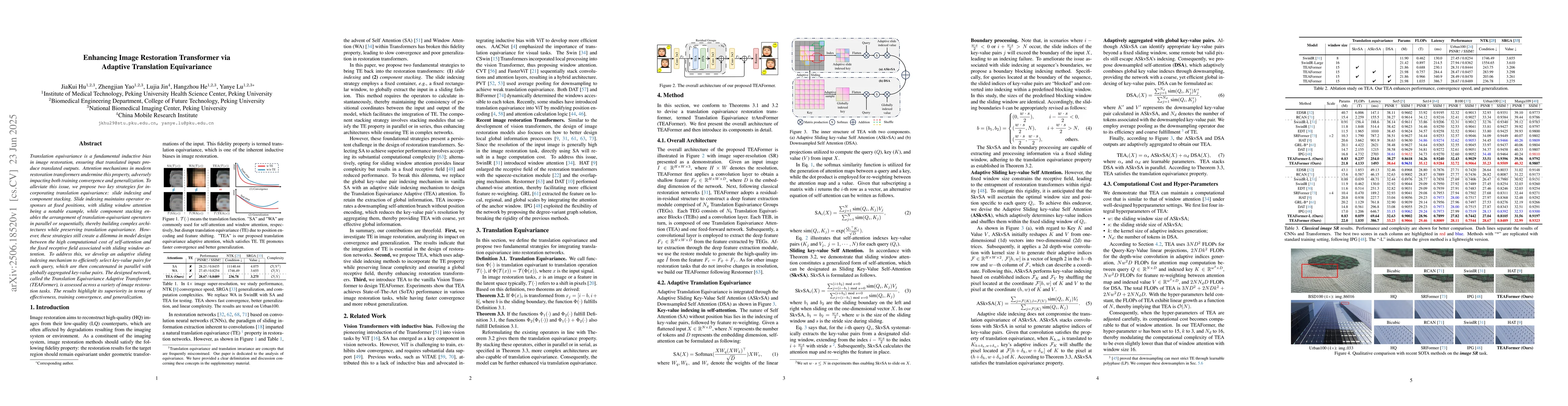 Translation equivariance is a fundamental inductive bias in image restoration, ensuring that translated inputs produce translated outputs. Attention mechanisms in modern restoration transformers undermine this property, adversely impacting both training convergence and generalization. To alleviate this issue, we propose two key strategies for incorporating translation equivariance: slide indexing and component stacking. Slide indexing maintains operator responses at fixed positions, with sliding window attention being a notable example, while component stacking enables the arrangement of translation-equivariant operators in parallel or sequentially, thereby building complex architectures while preserving translation equivariance. However, these strategies still create a dilemma in model design between the high computational cost of self-attention and the fixed receptive field associated with sliding window attention. To address this, we develop an adaptive sliding indexing mechanism to efficiently select key-value pairs for each query, which are then concatenated in parallel with globally aggregated key-value pairs. The designed network, called the Translation Equivariance Adaptive Transformer (TEAFormer), is assessed across a variety of image restoration tasks. The results highlight its superiority in terms of effectiveness, training convergence, and generalization.