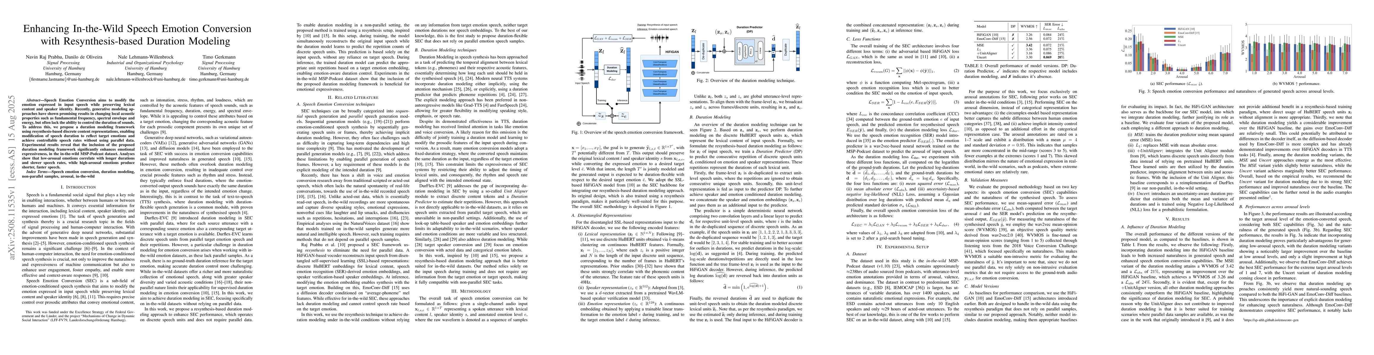Speech Emotion Conversion aims to modify the emotion expressed in input speech while preserving lexical content and speaker identity. Recently, generative modeling approaches have shown promising results in changing local acoustic properties such as fundamental frequency, spectral envelope and energy, but often lack the ability to control the duration of sounds. To address this, we propose a duration modeling framework using resynthesis-based discrete content representations, enabling modification of speech duration to reflect target emotions and achieve controllable speech rates without using parallel data. Experimental results reveal that the inclusion of the proposed duration modeling framework significantly enhances emotional expressiveness, in the in-the-wild MSP-Podcast dataset. Analyses show that low-arousal emotions correlate with longer durations and slower speech rates, while high-arousal emotions produce shorter, faster speech.