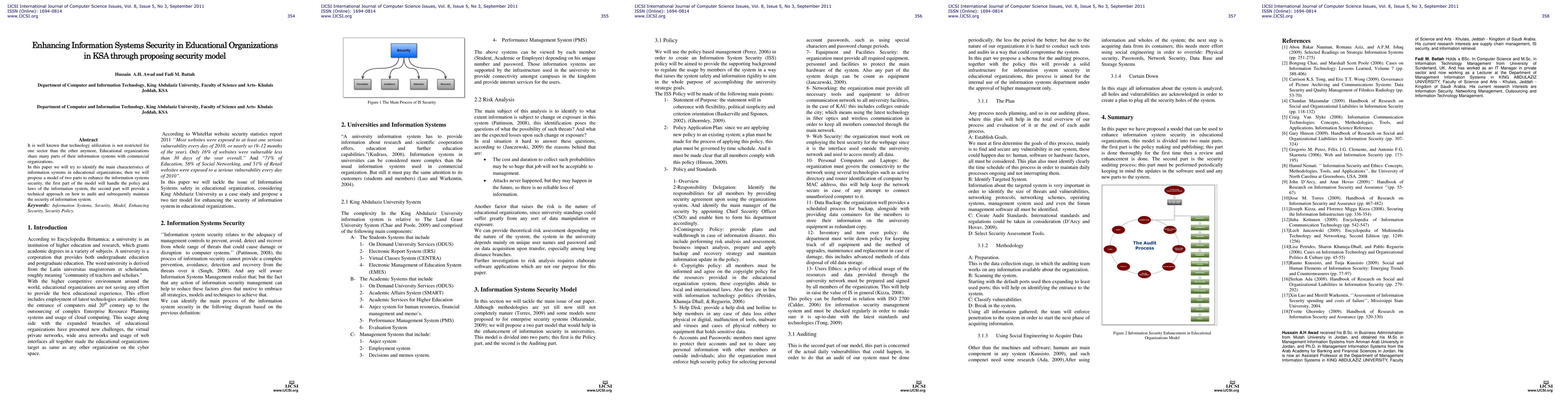 This paper identifies key characteristics of information systems in educational organizations in KSA and proposes a dual-part security model. The first part focuses on policy and legal frameworks, while the second part offers technical methods for auditing and maintaining information system security.
