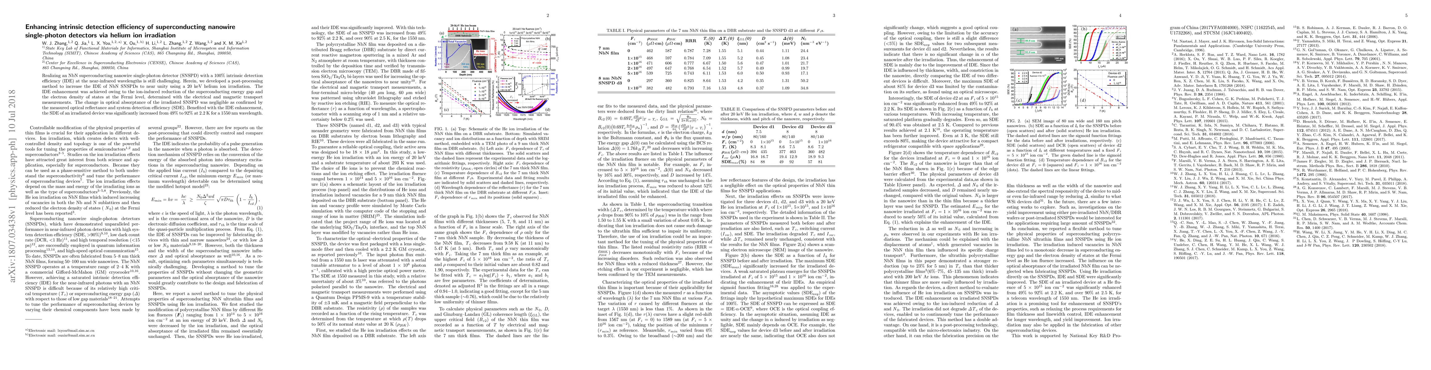 This paper presents a method to enhance the intrinsic detection efficiency (IDE) of NbN superconducting nanowire single-photon detectors (SNSPDs) using 20 keV helium ion irradiation, achieving near-unity IDE and significantly increasing system detection efficiency (SDE) from 49% to 92% at 2.2 K for 1550 nm wavelength.