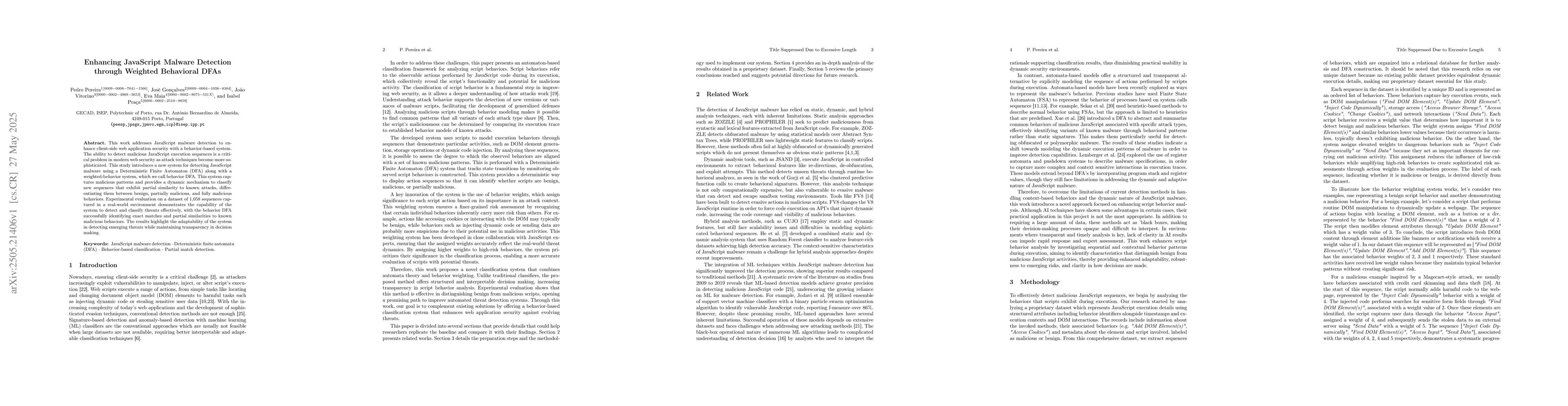 This research paper introduces a system for detecting JavaScript malware using a weighted behavior DFA that can identify exact matches, partial similarities to known malicious behaviors, and classify new sequences as benign, partially malicious, or fully malicious.
