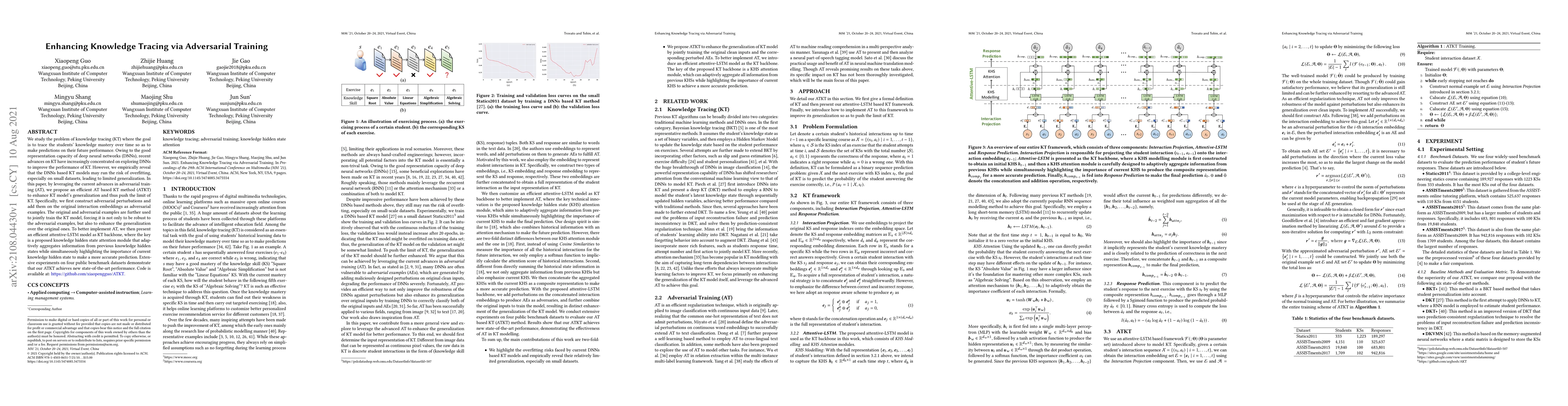 This paper proposes an adversarial training (AT) based method (ATKT) to enhance knowledge tracing (KT) models, addressing the issue of overfitting in deep neural network (DNN) based KT models. The ATKT method constructs adversarial examples to improve model robustness and generalization, utilizing an efficient attentive-LSTM model with a knowledge hidden state attention module to achieve state-of-the-art performance on benchmark datasets.