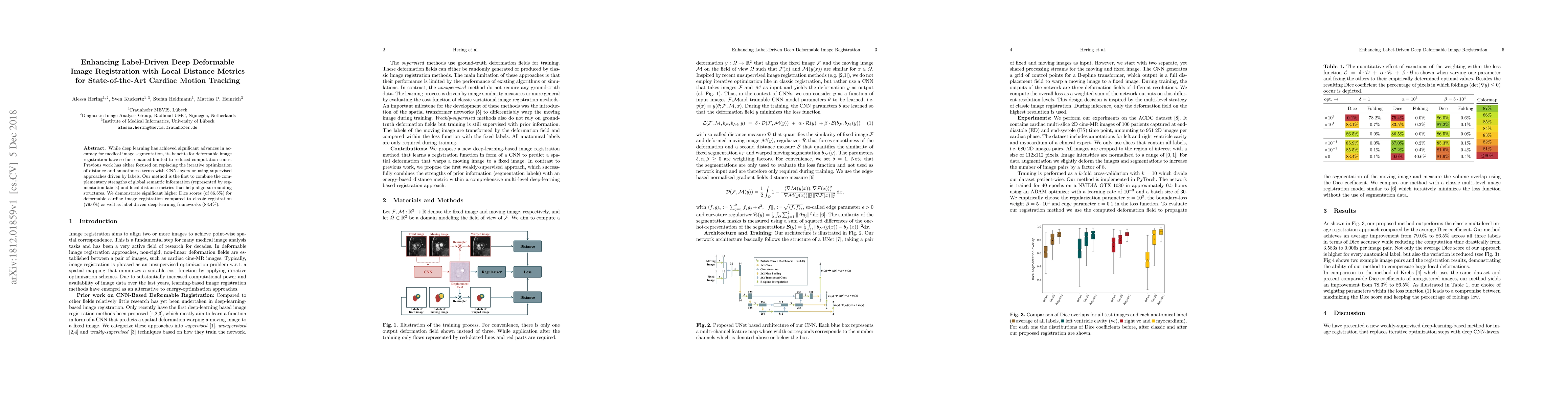 While deep learning has achieved significant advances in accuracy for medical image segmentation, its benefits for deformable image registration have so far remained limited to reduced computation times. Previous work has either focused on replacing the iterative optimization of distance and smoothness terms with CNN-layers or using supervised approaches driven by labels. Our method is the first to combine the complementary strengths of global semantic information (represented by segmentation labels) and local distance metrics that help align surrounding structures. We demonstrate significant higher Dice scores (of 86.5\%) for deformable cardiac image registration compared to classic registration (79.0\%) as well as label-driven deep learning frameworks (83.4\%).
