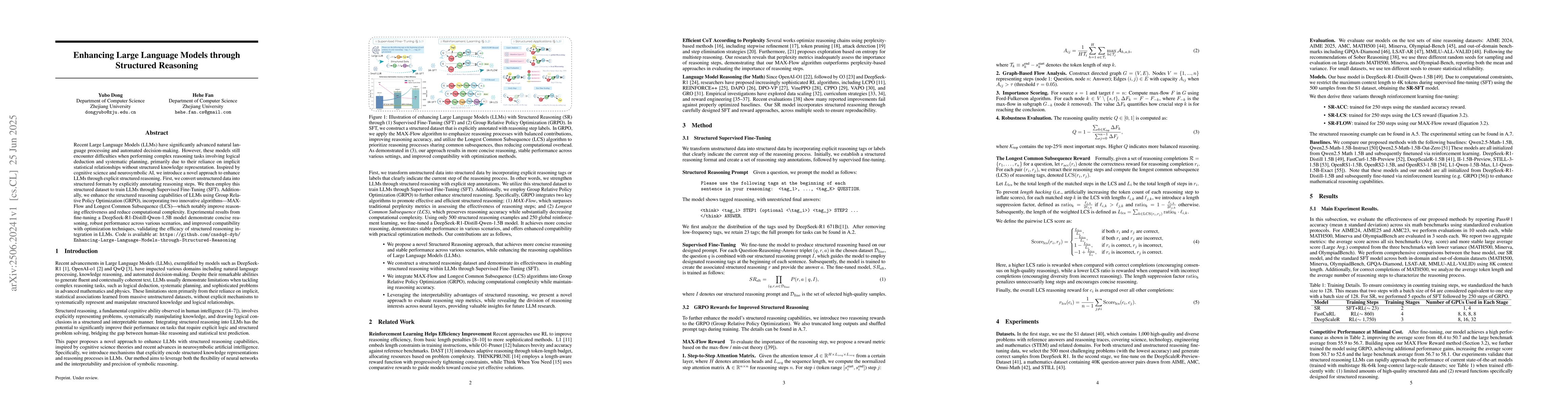 Recent Large Language Models (LLMs) have significantly advanced natural language processing and automated decision-making. However, these models still encounter difficulties when performing complex reasoning tasks involving logical deduction and systematic planning, primarily due to their reliance on implicit statistical relationships without structured knowledge representation.Inspired by cognitive science and neurosymbolic AI, we introduce a novel approach to enhance LLMs through explicit structured reasoning. First, we convert unstructured data into structured formats by explicitly annotating reasoning steps. We then employ this structured dataset to train LLMs through Supervised Fine-Tuning (SFT). Additionally, we enhance the structured reasoning capabilities of LLMs using Group Relative Policy Optimization (GRPO), incorporating two innovative algorithms--MAX-Flow and Longest Common Subsequence (LCS)--which notably improve reasoning effectiveness and reduce computational complexity. Experimental results from fine-tuning a DeepSeek-R1-Distill-Qwen-1.5B model demonstrate concise reasoning, robust performance across various scenarios, and improved compatibility with optimization techniques, validating the efficacy of structured reasoning integration in LLMs.