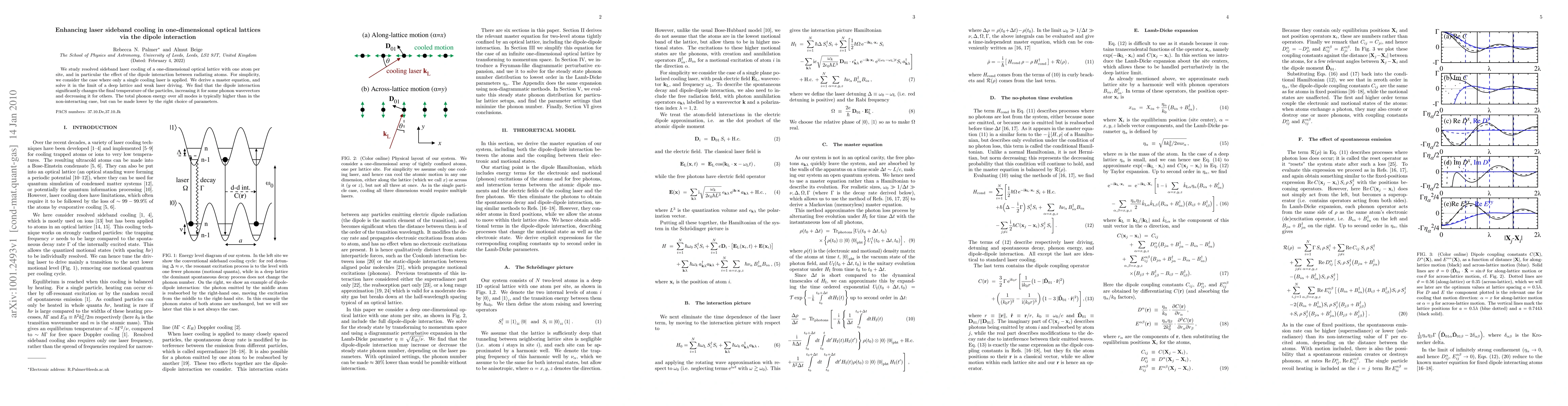 This paper investigates resolved sideband laser cooling in one-dimensional optical lattices, focusing on the dipole interaction between atoms. It finds that dipole interactions can either increase or decrease the final temperature of particles depending on phonon wavevectors, and while total phonon energy is generally higher, optimal parameters can reduce it.