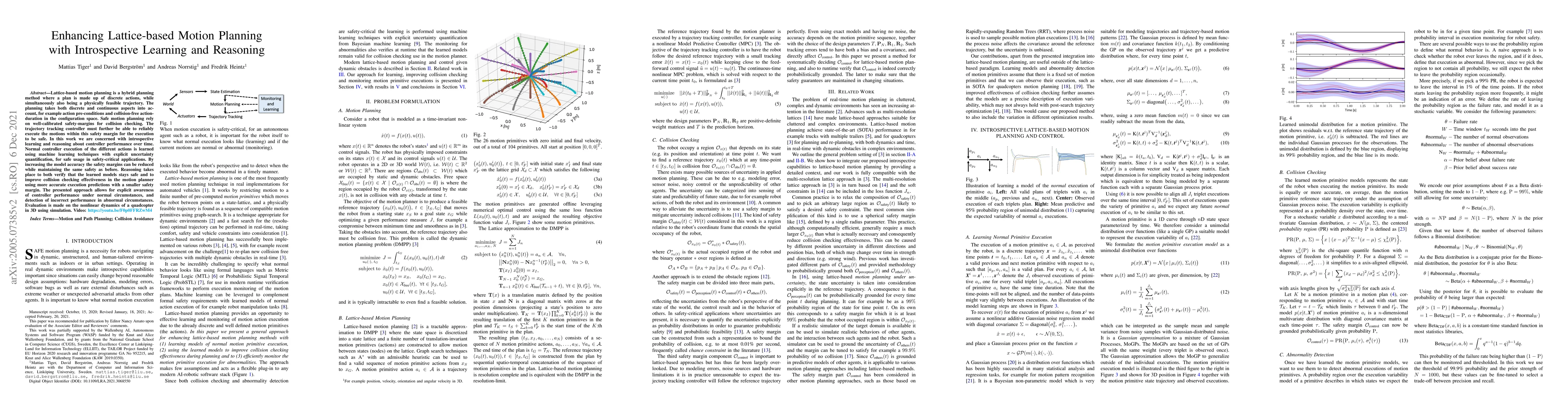 Lattice-based motion planning is a hybrid planning method where a plan made up of discrete actions simultaneously is a physically feasible trajectory. The planning takes both discrete and continuous aspects into account, for example action pre-conditions and collision-free action-duration in the configuration space. Safe motion planing rely on well-calibrated safety-margins for collision checking. The trajectory tracking controller must further be able to reliably execute the motions within this safety margin for the execution to be safe. In this work we are concerned with introspective learning and reasoning about controller performance over time. Normal controller execution of the different actions is learned using reliable and uncertainty-aware machine learning techniques. By correcting for execution bias we manage to substantially reduce the safety margin of motion actions. Reasoning takes place to both verify that the learned models stays safe and to improve collision checking effectiveness in the motion planner by the use of more accurate execution predictions with a smaller safety margin. The presented approach allows for explicit awareness of controller performance under normal circumstances, and timely detection of incorrect performance in abnormal circumstances. Evaluation is made on the nonlinear dynamics of a quadcopter in 3D using simulation. Video: https://youtu.be/STmZduvSUMM
