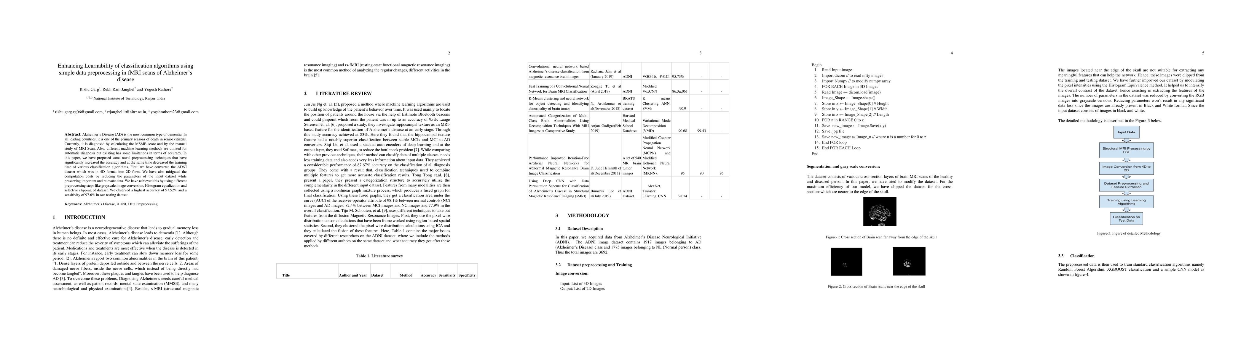 Alzheimer's Disease (AD) is the most common type of dementia. In all leading countries, it is one of the primary reasons of death in senior citizens. Currently, it is diagnosed by calculating the MSME score and by the manual study of MRI Scan. Also, different machine learning methods are utilized for automatic diagnosis but existing has some limitations in terms of accuracy. In this paper, we have proposed some novel preprocessing techniques that have significantly increased the accuracy and at the same time decreased the training time of various classification algorithms. First, we have converted the ADNI dataset which was in 4D format into 2D form. We have also mitigated the computation costs by reducing the parameters of the input dataset while preserving important and relevant data. We have achieved this by using different preprocessing steps like grayscale image conversion, Histogram equalization and selective clipping of dataset. We observed a highest accuracy of 97.52% and a sensitivity of 97.6% in our testing dataset.