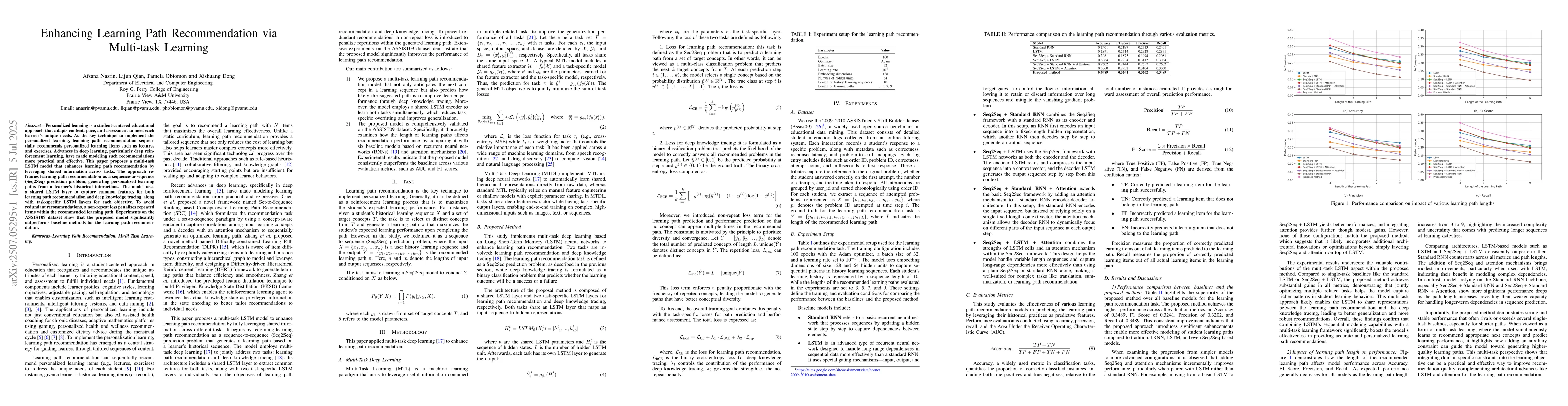 Personalized learning is a student-centered educational approach that adapts content, pace, and assessment to meet each learner's unique needs. As the key technique to implement the personalized learning, learning path recommendation sequentially recommends personalized learning items such as lectures and exercises. Advances in deep learning, particularly deep reinforcement learning, have made modeling such recommendations more practical and effective. This paper proposes a multi-task LSTM model that enhances learning path recommendation by leveraging shared information across tasks. The approach reframes learning path recommendation as a sequence-to-sequence (Seq2Seq) prediction problem, generating personalized learning paths from a learner's historical interactions. The model uses a shared LSTM layer to capture common features for both learning path recommendation and deep knowledge tracing, along with task-specific LSTM layers for each objective. To avoid redundant recommendations, a non-repeat loss penalizes repeated items within the recommended learning path. Experiments on the ASSIST09 dataset show that the proposed model significantly outperforms baseline methods for the learning path recommendation.