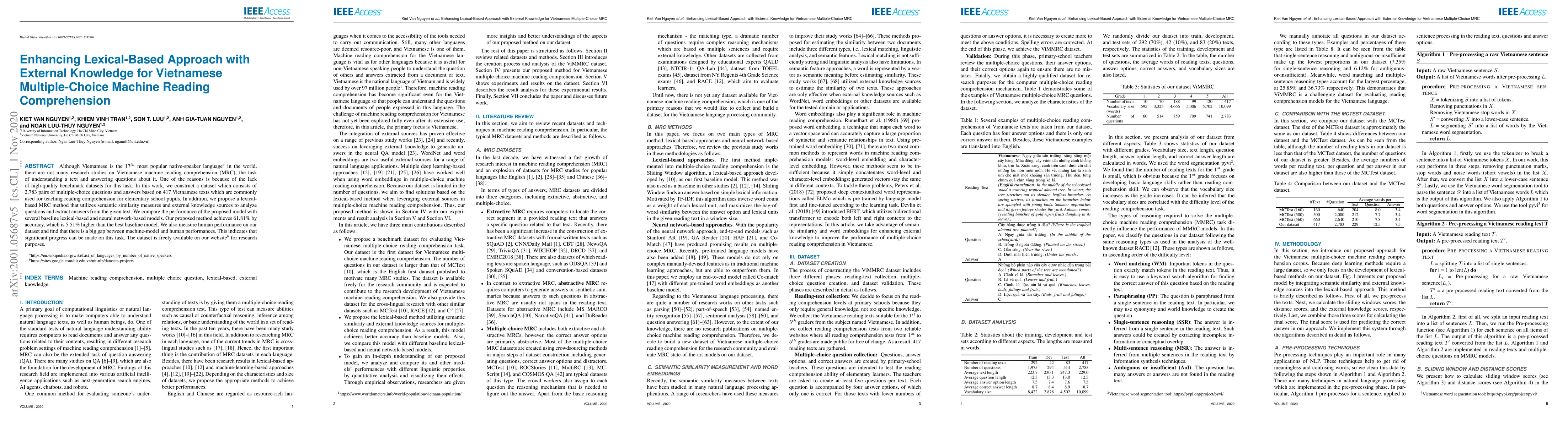 This paper constructs a Vietnamese multiple-choice machine reading comprehension dataset and proposes a lexical-based approach enhanced with external knowledge, achieving 61.81% accuracy—5.51% higher than the best baseline. The dataset and model aim to spur further research in Vietnamese MRC.