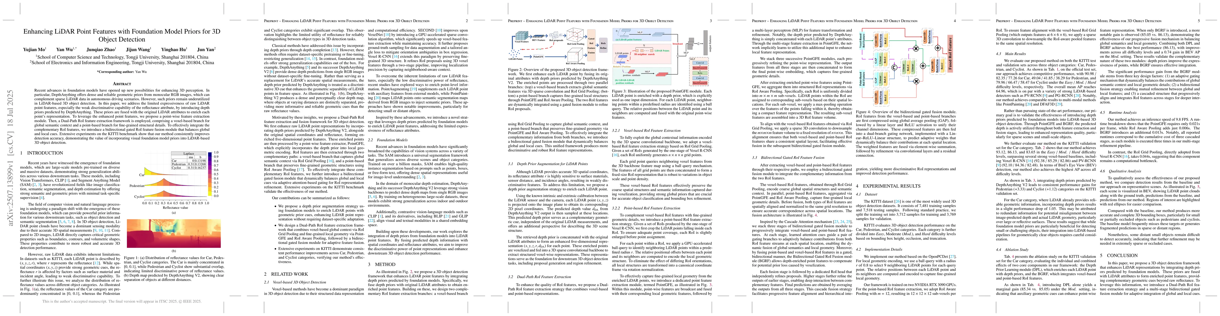 Recent advances in foundation models have opened up new possibilities for enhancing 3D perception. In particular, DepthAnything offers dense and reliable geometric priors from monocular RGB images, which can complement sparse LiDAR data in autonomous driving scenarios. However, such priors remain underutilized in LiDAR-based 3D object detection. In this paper, we address the limited expressiveness of raw LiDAR point features, especially the weak discriminative capability of the reflectance attribute, by introducing depth priors predicted by DepthAnything. These priors are fused with the original LiDAR attributes to enrich each point's representation. To leverage the enhanced point features, we propose a point-wise feature extraction module. Then, a Dual-Path RoI feature extraction framework is employed, comprising a voxel-based branch for global semantic context and a point-based branch for fine-grained structural details. To effectively integrate the complementary RoI features, we introduce a bidirectional gated RoI feature fusion module that balances global and local cues. Extensive experiments on the KITTI benchmark show that our method consistently improves detection accuracy, demonstrating the value of incorporating visual foundation model priors into LiDAR-based 3D object detection.