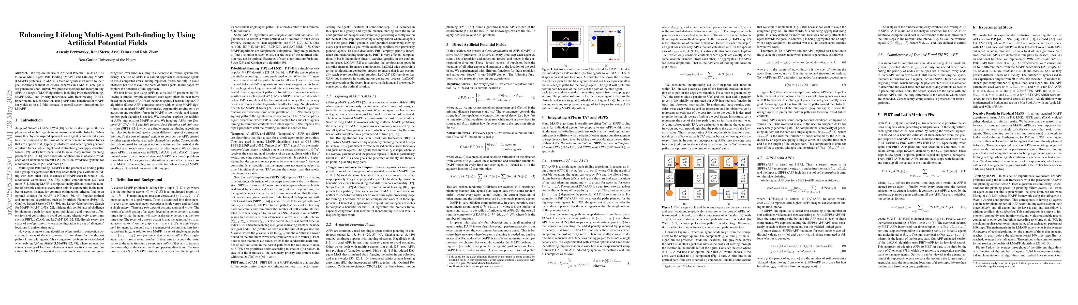 Researchers found that using Artificial Potential Fields improved system throughput in Lifelong Multi-Agent Path Finding problems, but not in traditional Multi-Agent Path Finding problems.