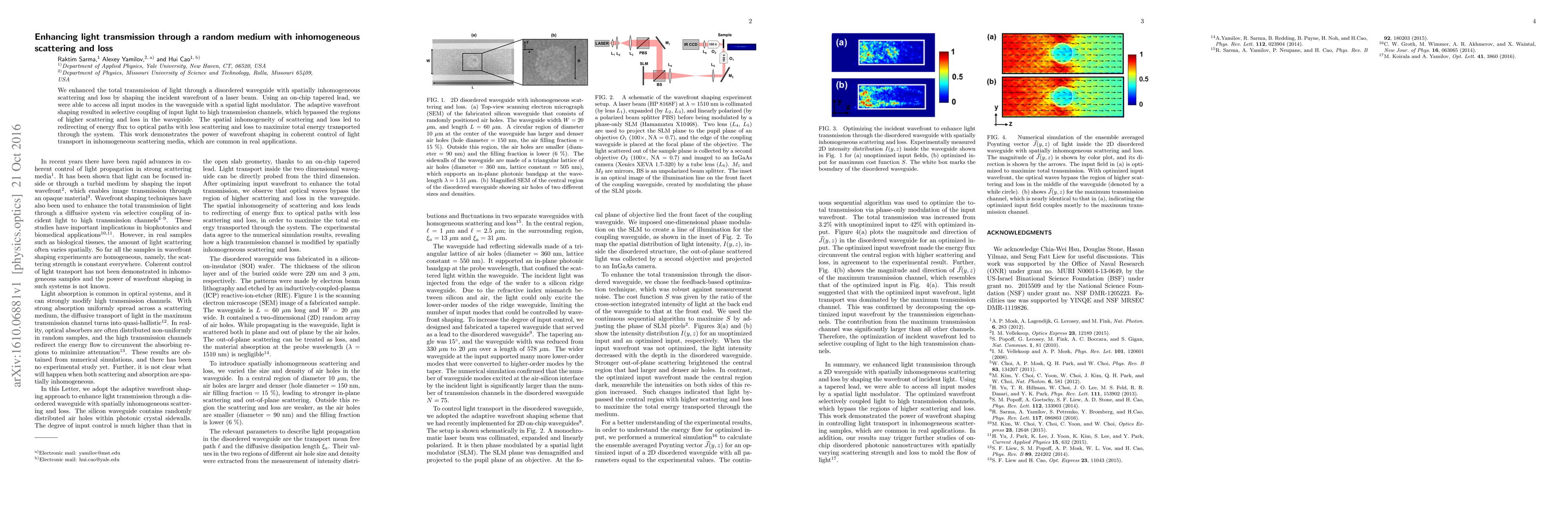 This paper demonstrates how adaptive wavefront shaping can enhance light transmission through a disordered waveguide with inhomogeneous scattering and loss by selectively coupling input light to high transmission channels, thereby maximizing energy transport. The use of a spatial light modulator and on-chip tapered lead enabled control over all input modes, redirecting energy flux to paths with less scattering and loss.