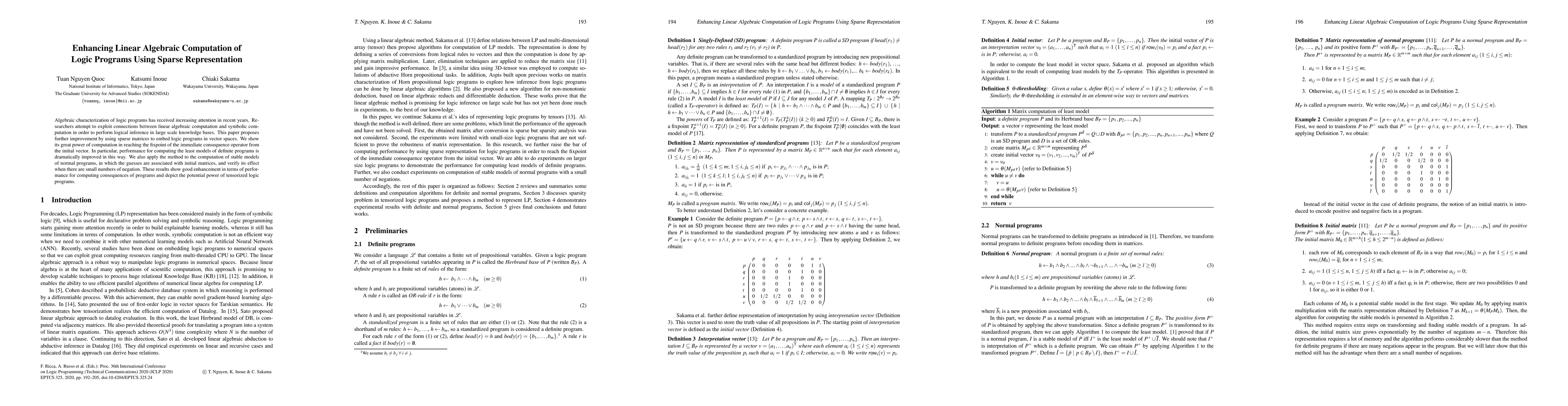 Algebraic characterization of logic programs has received increasing attention in recent years. Researchers attempt to exploit connections between linear algebraic computation and symbolic computation in order to perform logical inference in large scale knowledge bases. This paper proposes further improvement by using sparse matrices to embed logic programs in vector spaces. We show its great power of computation in reaching the fixpoint of the immediate consequence operator from the initial vector. In particular, performance for computing the least models of definite programs is dramatically improved in this way. We also apply the method to the computation of stable models of normal programs, in which the guesses are associated with initial matrices, and verify its effect when there are small numbers of negation. These results show good enhancement in terms of performance for computing consequences of programs and depict the potential power of tensorized logic programs.