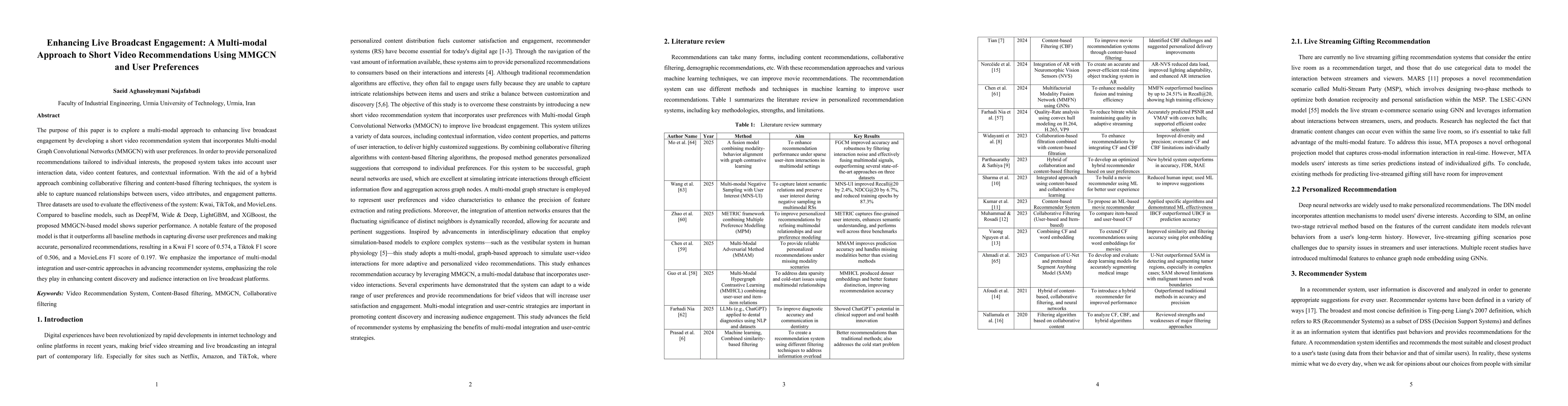The purpose of this paper is to explore a multi-modal approach to enhancing live broadcast engagement by developing a short video recommendation system that incorporates Multi-modal Graph Convolutional Networks (MMGCN) with user preferences. In order to provide personalized recommendations tailored to individual interests, the proposed system takes into account user interaction data, video content features, and contextual information. With the aid of a hybrid approach combining collaborative filtering and content-based filtering techniques, the system is able to capture nuanced relationships between users, video attributes, and engagement patterns. Three datasets are used to evaluate the effectiveness of the system: Kwai, TikTok, and MovieLens. Compared to baseline models, such as DeepFM, Wide & Deep, LightGBM, and XGBoost, the proposed MMGCN-based model shows superior performance. A notable feature of the proposed model is that it outperforms all baseline methods in capturing diverse user preferences and making accurate, personalized recommendations, resulting in a Kwai F1 score of 0.574, a Tiktok F1 score of 0.506, and a MovieLens F1 score of 0.197. We emphasize the importance of multi-modal integration and user-centric approaches in advancing recommender systems, emphasizing the role they play in enhancing content discovery and audience interaction on live broadcast platforms.