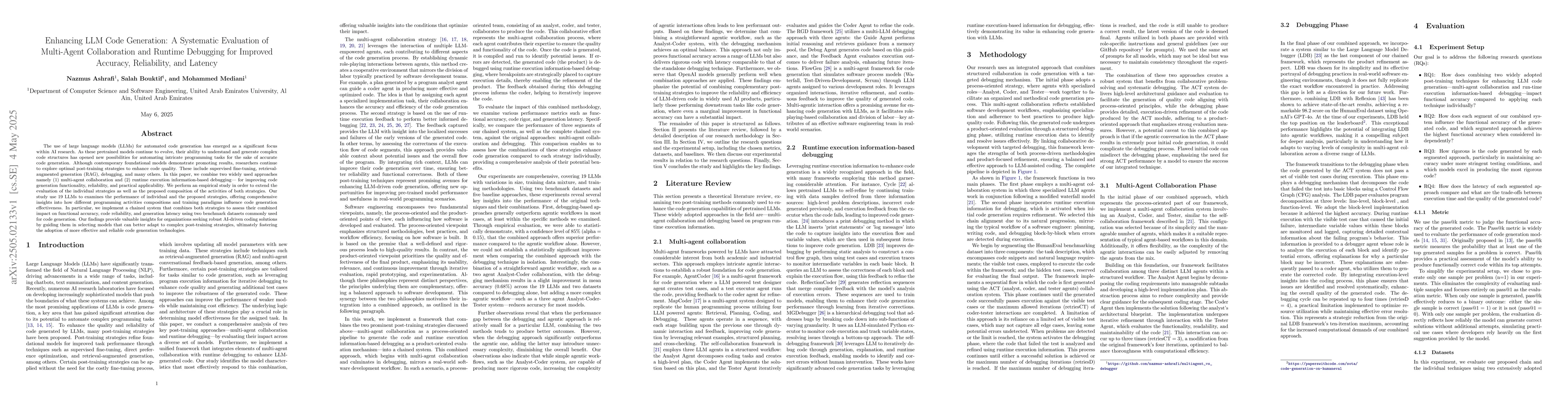 The novelty of this work lies in its systematic evaluation of combining multi-agent collaboration and runtime debugging for code generation, providing a detailed analysis of their combined impact on functional accuracy, code reliability, and generation latency using a diverse range of LLMs.