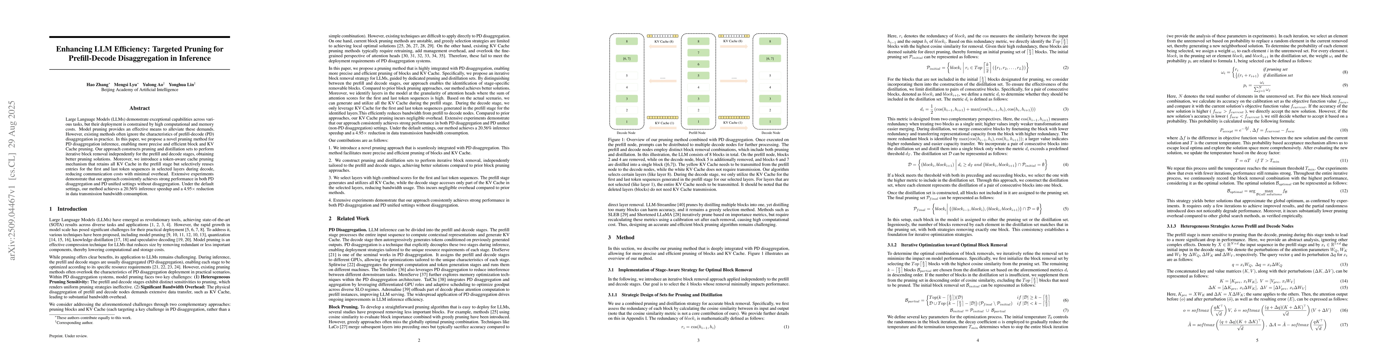 Large Language Models (LLMs) demonstrate exceptional capabilities across various tasks, but their deployment is constrained by high computational and memory costs. Model pruning provides an effective means to alleviate these demands. However, existing methods often ignore the characteristics of prefill-decode (PD) disaggregation in practice. In this paper, we propose a novel pruning method for PD disaggregation inference, enabling more precise and efficient block and KV Cache pruning. Our approach constructs pruning and distillation sets to perform iterative block removal independently for the prefill and decode stages, obtaining better pruning solutions. Moreover, we introduce a token-aware cache pruning mechanism that retains all KV Cache in the prefill stage but selectively reuses entries for the first and last token sequences in selected layers during decode, reducing communication costs with minimal overhead. Extensive experiments demonstrate that our approach consistently achieves strong performance in both PD disaggregation and PD unified settings without disaggregation. Under the default settings, our method achieves a 20.56% inference speedup and a 4.95 times reduction in data transmission bandwidth consumption.