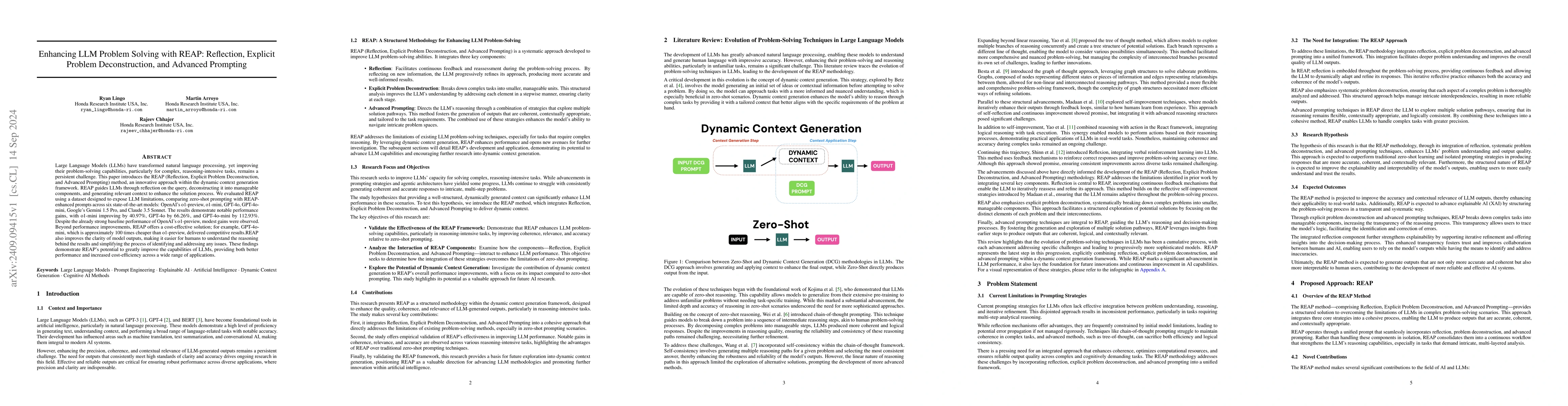 Large Language Models (LLMs) have transformed natural language processing, yet improving their problem-solving capabilities, particularly for complex, reasoning-intensive tasks, remains a persistent challenge. This paper introduces the REAP (Reflection, Explicit Problem Deconstruction, and Advanced Prompting) method, an innovative approach within the dynamic context generation framework. REAP guides LLMs through reflection on the query, deconstructing it into manageable components, and generating relevant context to enhance the solution process. We evaluated REAP using a dataset designed to expose LLM limitations, comparing zero-shot prompting with REAP-enhanced prompts across six state-of-the-art models: OpenAI's o1-preview, o1-mini, GPT-4o, GPT-4o-mini, Google's Gemini 1.5 Pro, and Claude 3.5 Sonnet. The results demonstrate notable performance gains, with o1-mini improving by 40.97%, GPT-4o by 66.26%, and GPT-4o-mini by 112.93%. Despite the already strong baseline performance of OpenAI's o1-preview, modest gains were observed. Beyond performance improvements, REAP offers a cost-effective solution; for example, GPT-4o-mini, which is approximately 100 times cheaper than o1-preview, delivered competitive results. REAP also improves the clarity of model outputs, making it easier for humans to understand the reasoning behind the results and simplifying the process of identifying and addressing any issues. These findings demonstrate REAP's potential to greatly improve the capabilities of LLMs, providing both better performance and increased cost-efficiency across a wide range of applications.