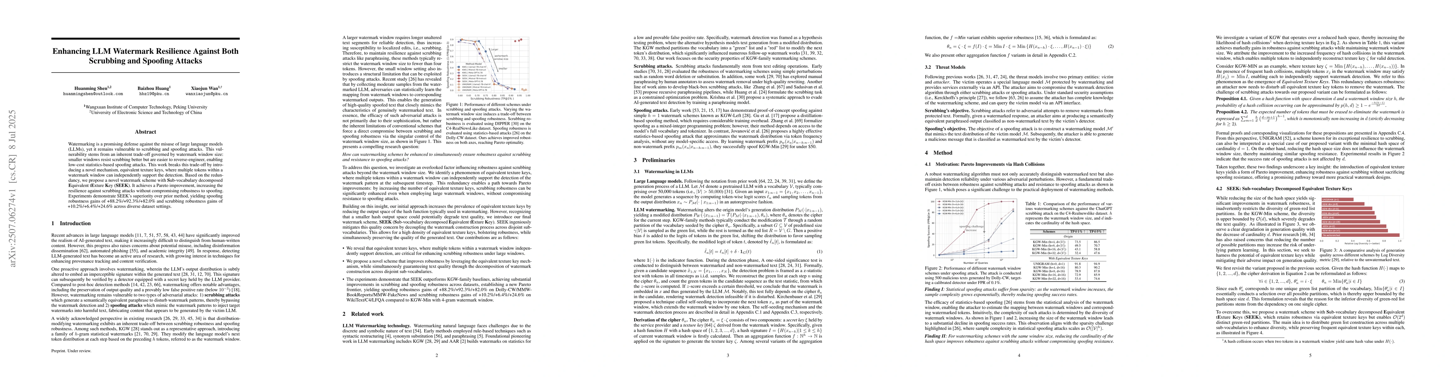 Watermarking is a promising defense against the misuse of large language models (LLMs), yet it remains vulnerable to scrubbing and spoofing attacks. This vulnerability stems from an inherent trade-off governed by watermark window size: smaller windows resist scrubbing better but are easier to reverse-engineer, enabling low-cost statistics-based spoofing attacks. This work breaks this trade-off by introducing a novel mechanism, equivalent texture keys, where multiple tokens within a watermark window can independently support the detection. Based on the redundancy, we propose a novel watermark scheme with Sub-vocabulary decomposed Equivalent tExture Key (SEEK). It achieves a Pareto improvement, increasing the resilience against scrubbing attacks without compromising robustness to spoofing. Experiments demonstrate SEEK's superiority over prior method, yielding spoofing robustness gains of +88.2%/+92.3%/+82.0% and scrubbing robustness gains of +10.2%/+6.4%/+24.6% across diverse dataset settings.