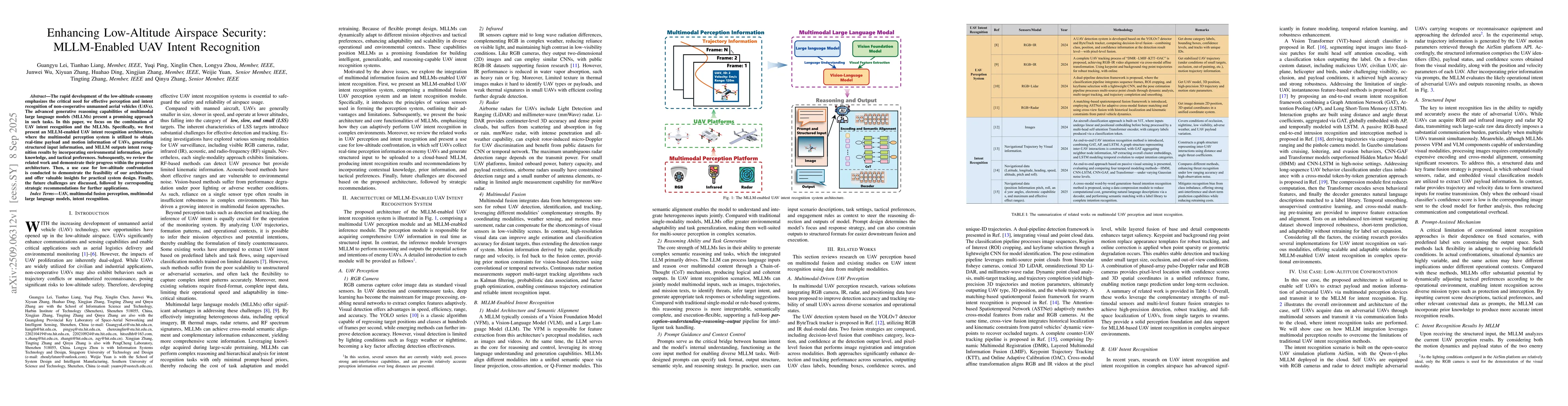 The rapid development of the low-altitude economy emphasizes the critical need for effective perception and intent recognition of non-cooperative unmanned aerial vehicles (UAVs). The advanced generative reasoning capabilities of multimodal large language models (MLLMs) present a promising approach in such tasks. In this paper, we focus on the combination of UAV intent recognition and the MLLMs. Specifically, we first present an MLLM-enabled UAV intent recognition architecture, where the multimodal perception system is utilized to obtain real-time payload and motion information of UAVs, generating structured input information, and MLLM outputs intent recognition results by incorporating environmental information, prior knowledge, and tactical preferences. Subsequently, we review the related work and demonstrate their progress within the proposed architecture. Then, a use case for low-altitude confrontation is conducted to demonstrate the feasibility of our architecture and offer valuable insights for practical system design. Finally, the future challenges are discussed, followed by corresponding strategic recommendations for further applications.
