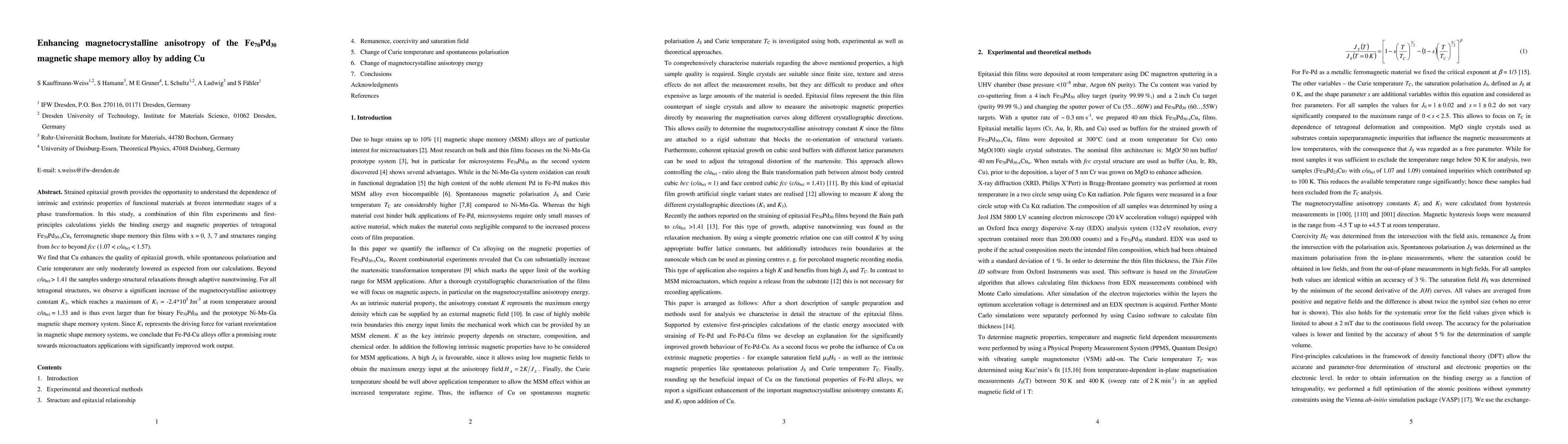 This study combines thin film experiments and calculations to investigate Fe70Pd30-xCux alloys, finding that adding Cu enhances epitaxial growth quality and significantly increases magnetocrystalline anisotropy (K1), reaching a maximum at c/a_bct=1.33. This improvement suggests Fe-Pd-Cu alloys as promising for microactuator applications with better performance.