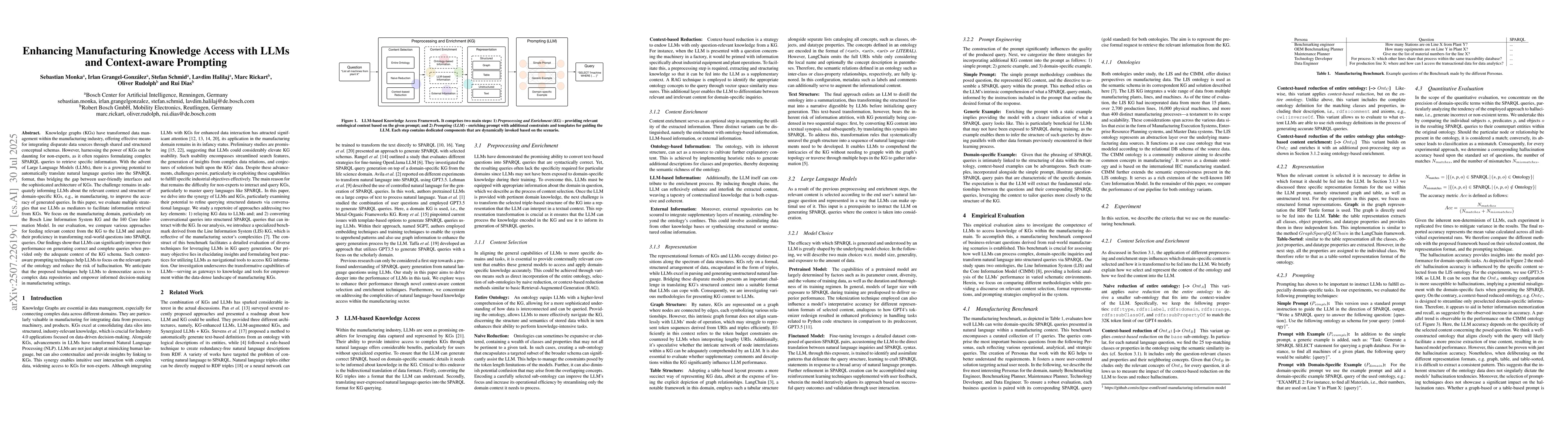 The paper presents context-aware prompting techniques that leverage domain-specific manufacturing data to generate SPARQL queries from natural language questions using LLMs.