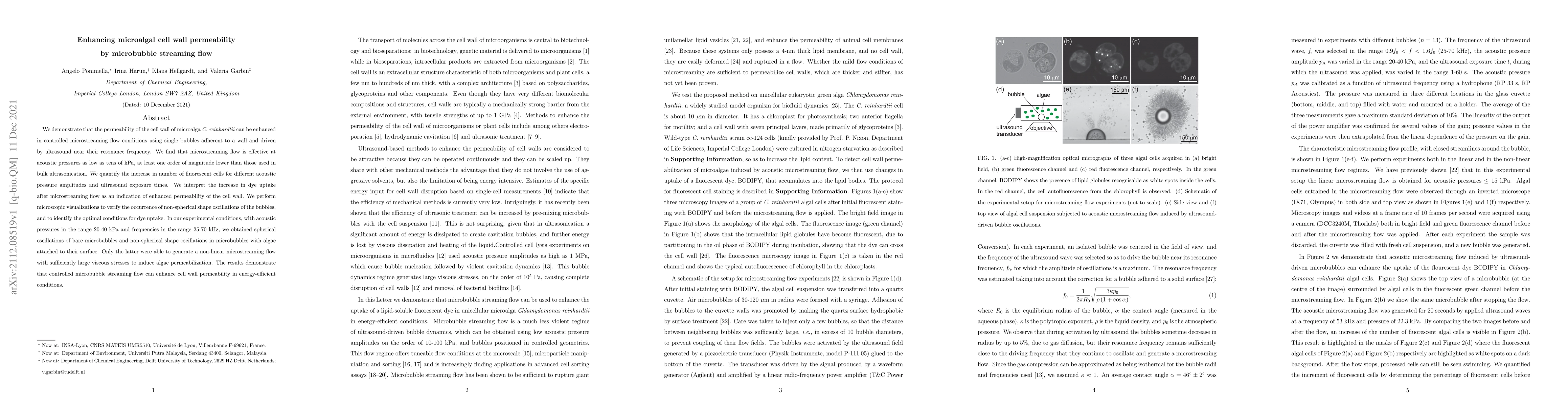 This study shows that microstreaming flow generated by microbubbles driven by ultrasound can significantly enhance the permeability of microalga *C. reinhardtii* cell walls at acoustic pressures much lower than traditional ultrasonication methods. The optimal conditions for dye uptake involve non-spherical bubble oscillations with algae attached, indicating efficient permeabilization.
