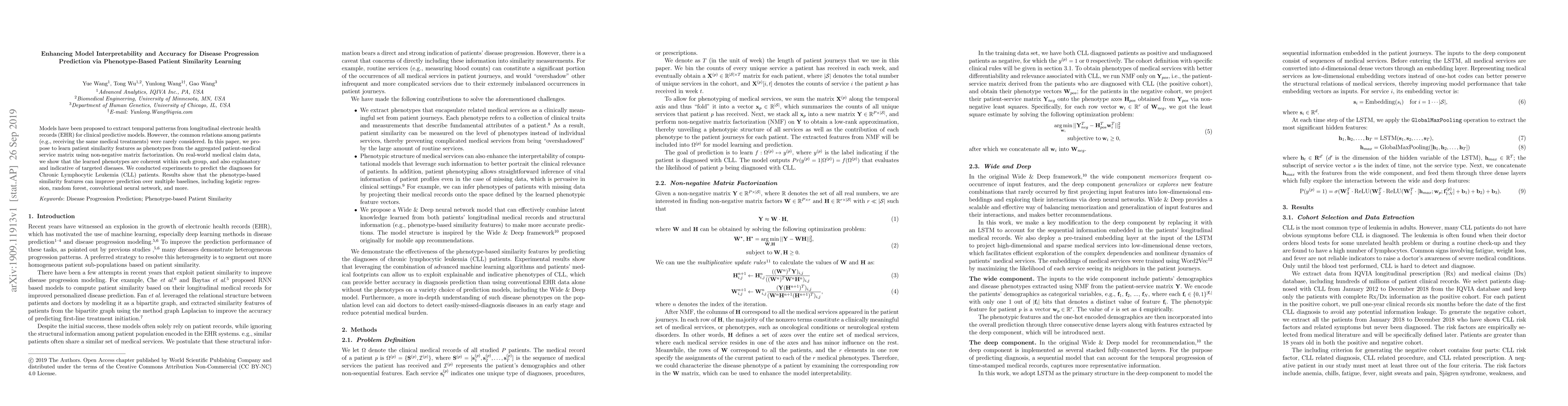 This paper proposes using phenotype-based patient similarity learning to enhance disease progression prediction models. The method extracts temporal patterns from EHR data and improves prediction accuracy for Chronic Lymphocytic Leukemia by incorporating patient similarity features derived from medical treatment relations.