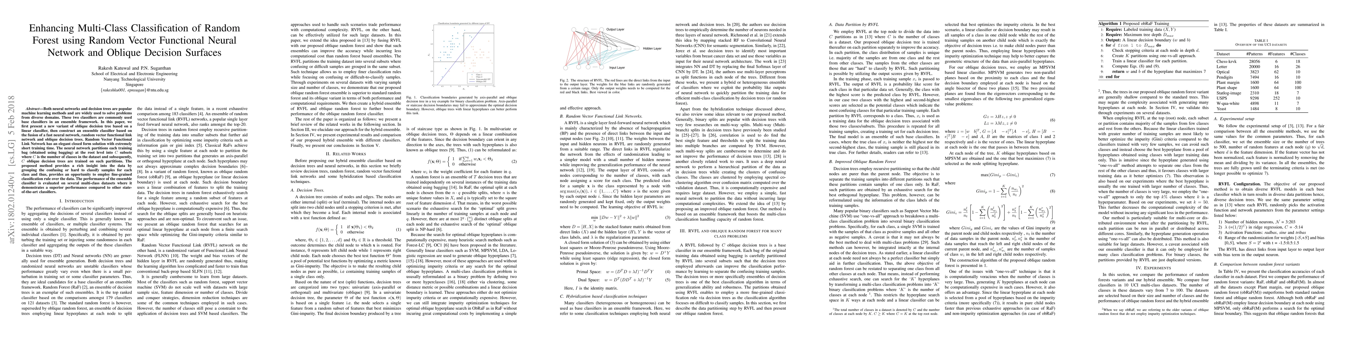 This paper introduces a novel ensemble classifier combining a Random Vector Functional Link Network, a fast neural network, and oblique decision trees to enhance multi-class classification. The proposed method shows superior performance on multi-class datasets compared to other state-of-the-art classifiers.