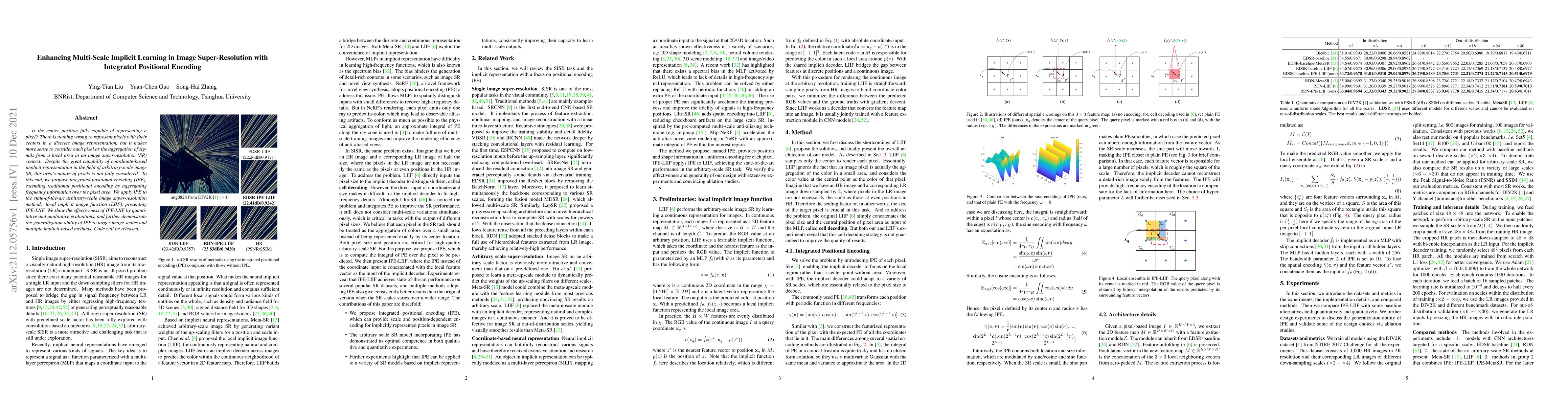 This paper proposes integrated positional encoding (IPE) to enhance multi-scale implicit learning in image super-resolution by considering each pixel as an aggregation of local area signals. The IPE-enhanced local implicit image function (IPE-LIIF) demonstrates superior performance and generalization across various image scales.
