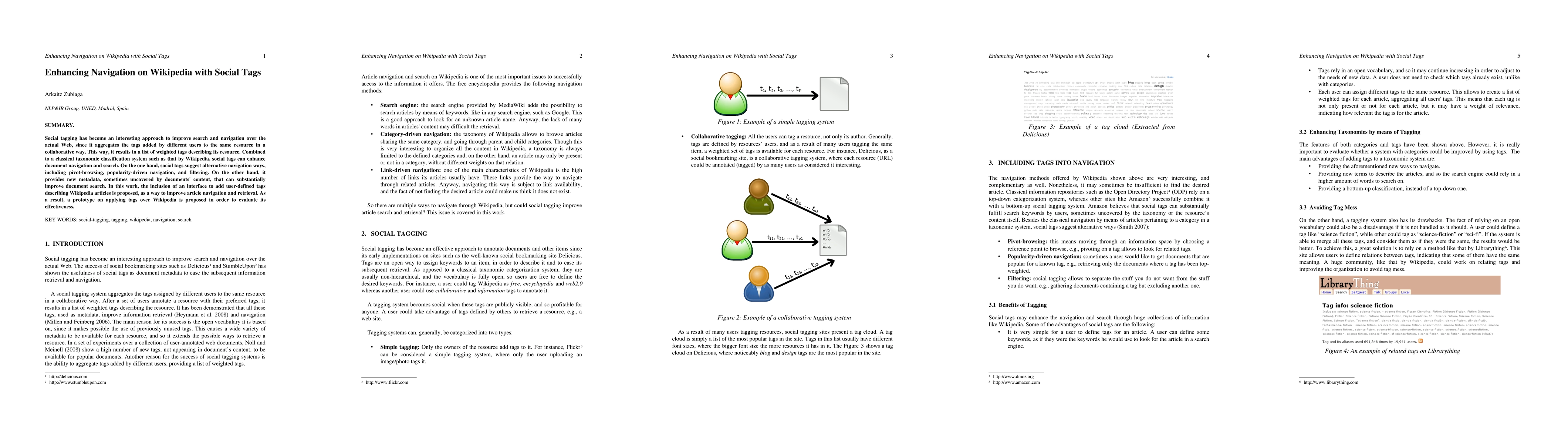 This paper explores integrating social tags into Wikipedia to enhance navigation and search, proposing an interface for users to add tags. A prototype is developed to evaluate how social tags can improve article navigation and retrieval by suggesting alternative pathways and providing new metadata.