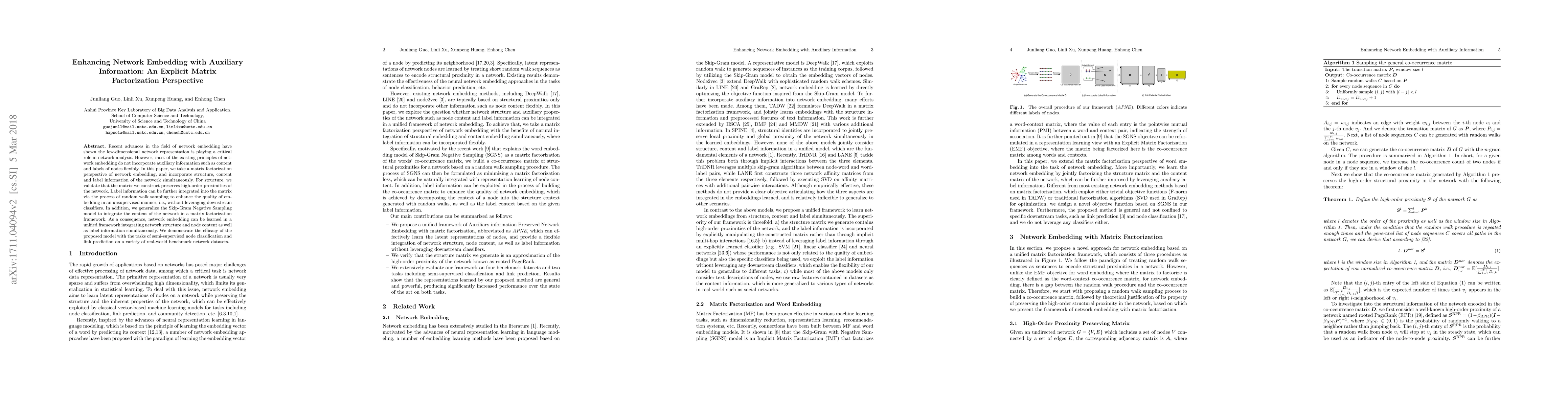 This paper proposes a matrix factorization approach to network embedding that integrates network structure, node content, and label information. The method enhances embedding quality through unsupervised random walk sampling and a generalized Skip-Gram model, demonstrating improved performance in semi-supervised classification and link prediction tasks.