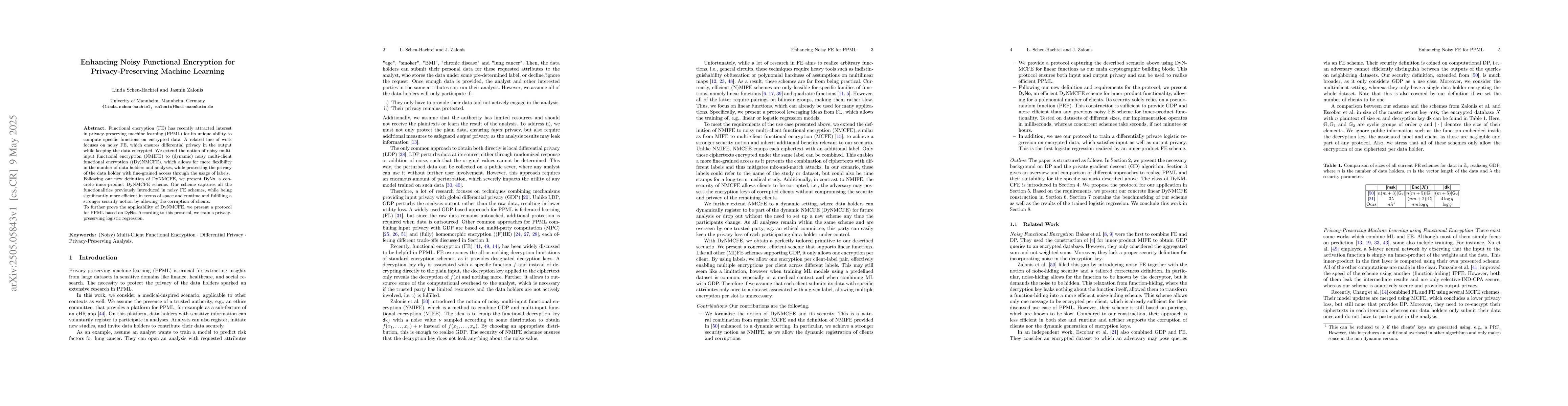 This work introduces DyNMCFE, extending existing noisy FE concepts to support dynamic client participation and fine-grained access control, making it a novel approach for privacy-preserving machine learning.