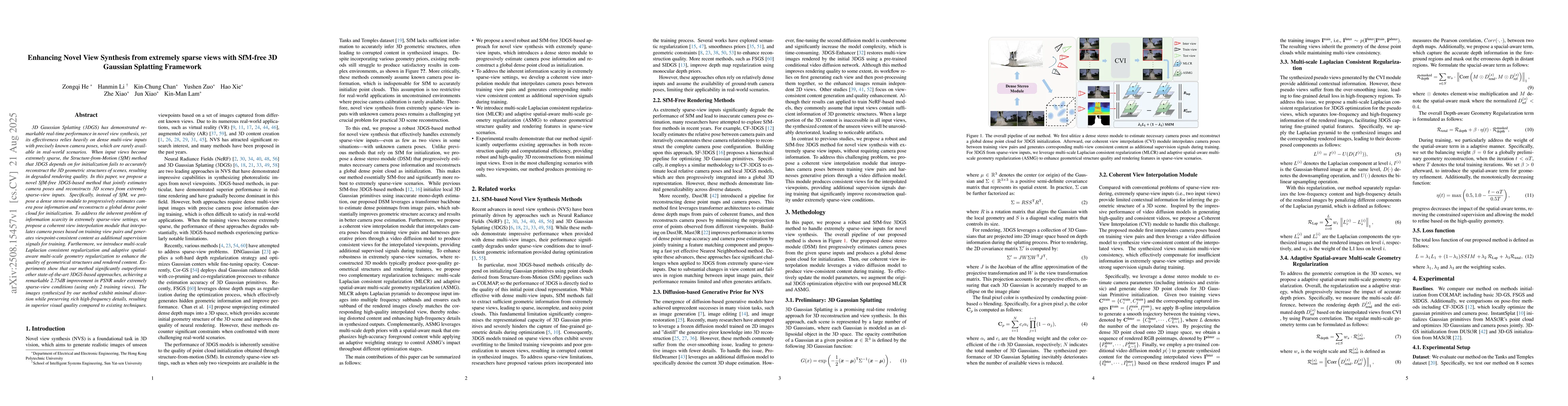 3D Gaussian Splatting (3DGS) has demonstrated remarkable real-time performance in novel view synthesis, yet its effectiveness relies heavily on dense multi-view inputs with precisely known camera poses, which are rarely available in real-world scenarios. When input views become extremely sparse, the Structure-from-Motion (SfM) method that 3DGS depends on for initialization fails to accurately reconstruct the 3D geometric structures of scenes, resulting in degraded rendering quality. In this paper, we propose a novel SfM-free 3DGS-based method that jointly estimates camera poses and reconstructs 3D scenes from extremely sparse-view inputs. Specifically, instead of SfM, we propose a dense stereo module to progressively estimates camera pose information and reconstructs a global dense point cloud for initialization. To address the inherent problem of information scarcity in extremely sparse-view settings, we propose a coherent view interpolation module that interpolates camera poses based on training view pairs and generates viewpoint-consistent content as additional supervision signals for training. Furthermore, we introduce multi-scale Laplacian consistent regularization and adaptive spatial-aware multi-scale geometry regularization to enhance the quality of geometrical structures and rendered content. Experiments show that our method significantly outperforms other state-of-the-art 3DGS-based approaches, achieving a remarkable 2.75dB improvement in PSNR under extremely sparse-view conditions (using only 2 training views). The images synthesized by our method exhibit minimal distortion while preserving rich high-frequency details, resulting in superior visual quality compared to existing techniques.