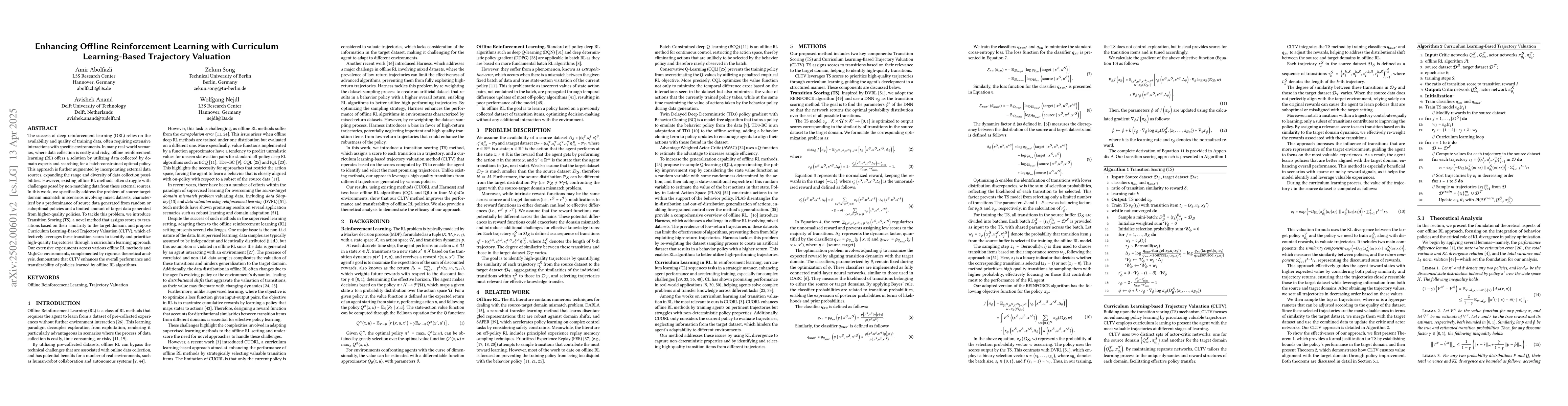 This paper introduces Curriculum Learning-Based Trajectory Valuation (CLTV) to enhance offline reinforcement learning by addressing domain mismatch issues. CLTV employs Transition Scoring (TS) to prioritize high-quality trajectories, improving policy performance and transferability across environments.