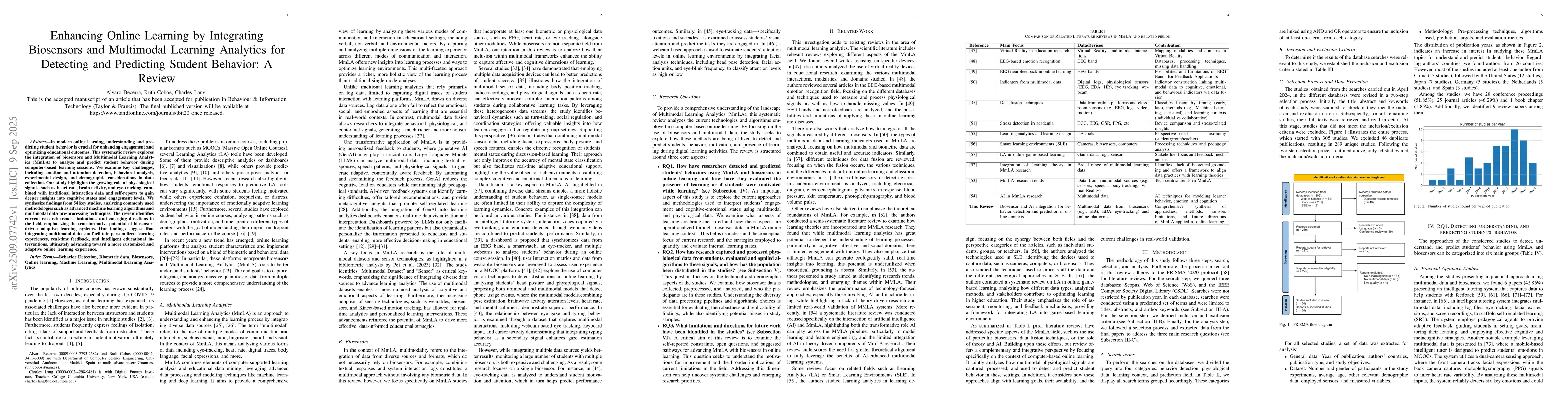 In modern online learning, understanding and predicting student behavior is crucial for enhancing engagement and optimizing educational outcomes. This systematic review explores the integration of biosensors and Multimodal Learning Analytics (MmLA) to analyze and predict student behavior during computer-based learning sessions. We examine key challenges, including emotion and attention detection, behavioral analysis, experimental design, and demographic considerations in data collection. Our study highlights the growing role of physiological signals, such as heart rate, brain activity, and eye-tracking, combined with traditional interaction data and self-reports to gain deeper insights into cognitive states and engagement levels. We synthesize findings from 54 key studies, analyzing commonly used methodologies such as advanced machine learning algorithms and multimodal data pre-processing techniques. The review identifies current research trends, limitations, and emerging directions in the field, emphasizing the transformative potential of biosensor-driven adaptive learning systems. Our findings suggest that integrating multimodal data can facilitate personalized learning experiences, real-time feedback, and intelligent educational interventions, ultimately advancing toward a more customized and adaptive online learning experience.