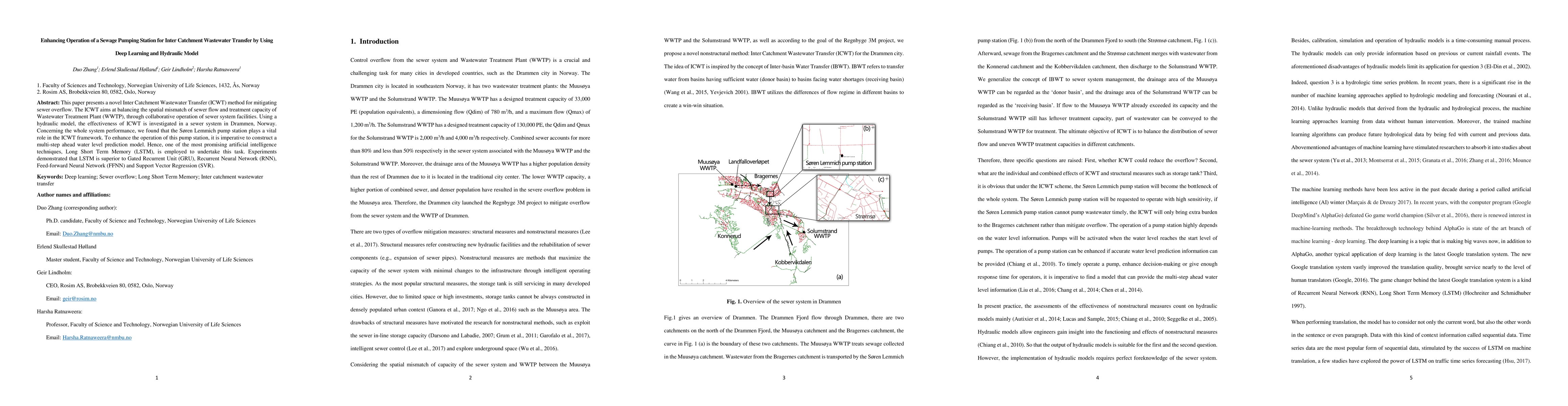 This paper presents a novel Inter Catchment Wastewater Transfer (ICWT) method for mitigating sewer overflow. The ICWT aims at balancing the spatial mismatch of sewer flow and treatment capacity of Wastewater Treatment Plant (WWTP), through collaborative operation of sewer system facilities. Using a hydraulic model, the effectiveness of ICWT is investigated in a sewer system in Drammen, Norway. Concerning the whole system performance, we found that the S{\o}ren Lemmich pump station plays a vital role in the ICWT framework. To enhance the operation of this pump station, it is imperative to construct a multi-step ahead water level prediction model. Hence, one of the most promising artificial intelligence techniques, Long Short Term Memory (LSTM), is employed to undertake this task. Experiments demonstrated that LSTM is superior to Gated Recurrent Unit (GRU), Recurrent Neural Network (RNN), Feed-forward Neural Network (FFNN) and Support Vector Regression (SVR).