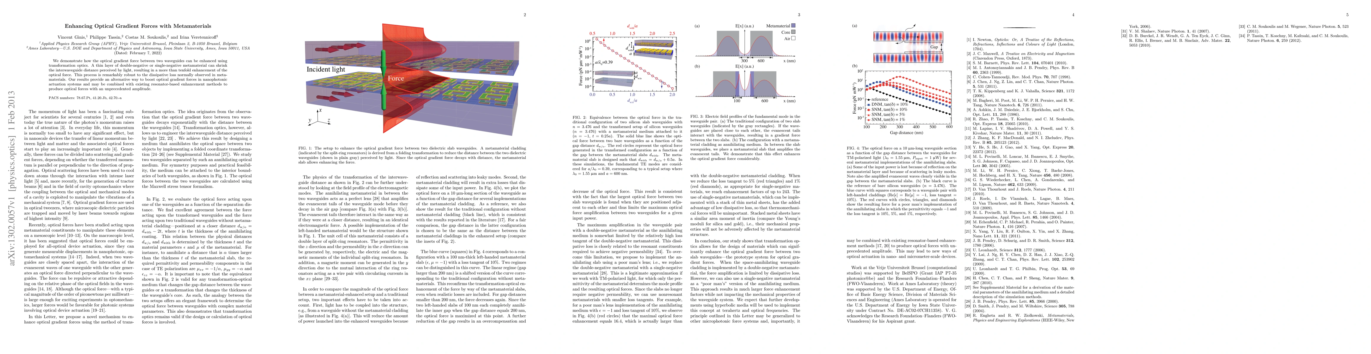 This paper shows that using metamaterials, specifically double-negative or single-negative types, can significantly enhance the optical gradient force between waveguides by shrinking the perceived interwaveguide distance, achieving over tenfold force enhancement. The method remains effective despite typical metamaterial losses.
