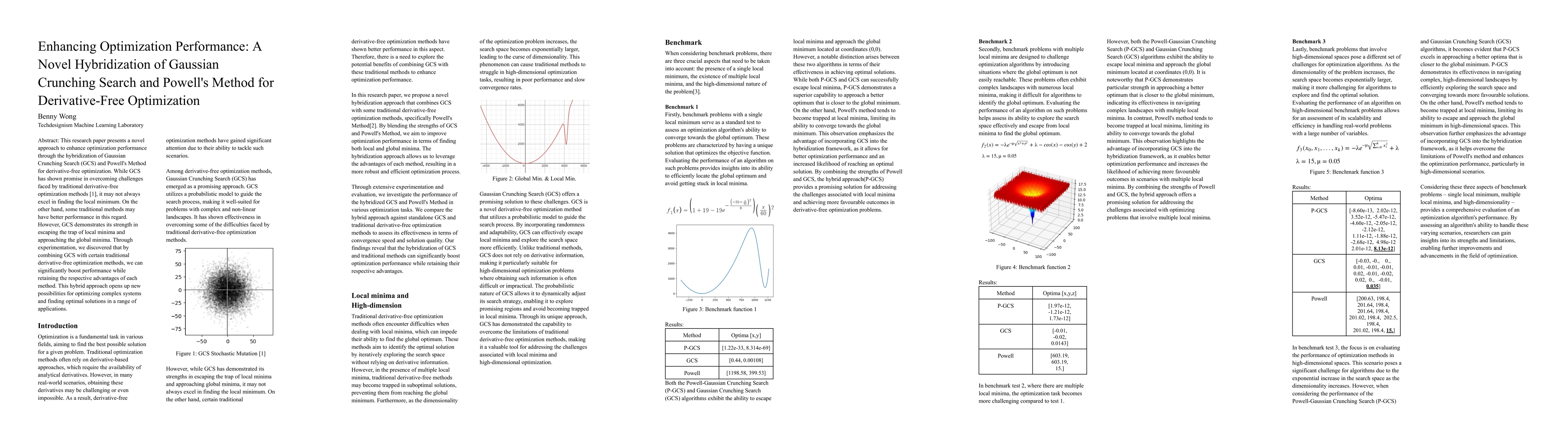 This research paper presents a novel approach to enhance optimization performance through the hybridization of Gaussian Crunching Search (GCS) and Powell's Method for derivative-free optimization. While GCS has shown promise in overcoming challenges faced by traditional derivative-free optimization methods [1], it may not always excel in finding the local minimum. On the other hand, some traditional methods may have better performance in this regard. However, GCS demonstrates its strength in escaping the trap of local minima and approaching the global minima. Through experimentation, we discovered that by combining GCS with certain traditional derivative-free optimization methods, we can significantly boost performance while retaining the respective advantages of each method. This hybrid approach opens up new possibilities for optimizing complex systems and finding optimal solutions in a range of applications.