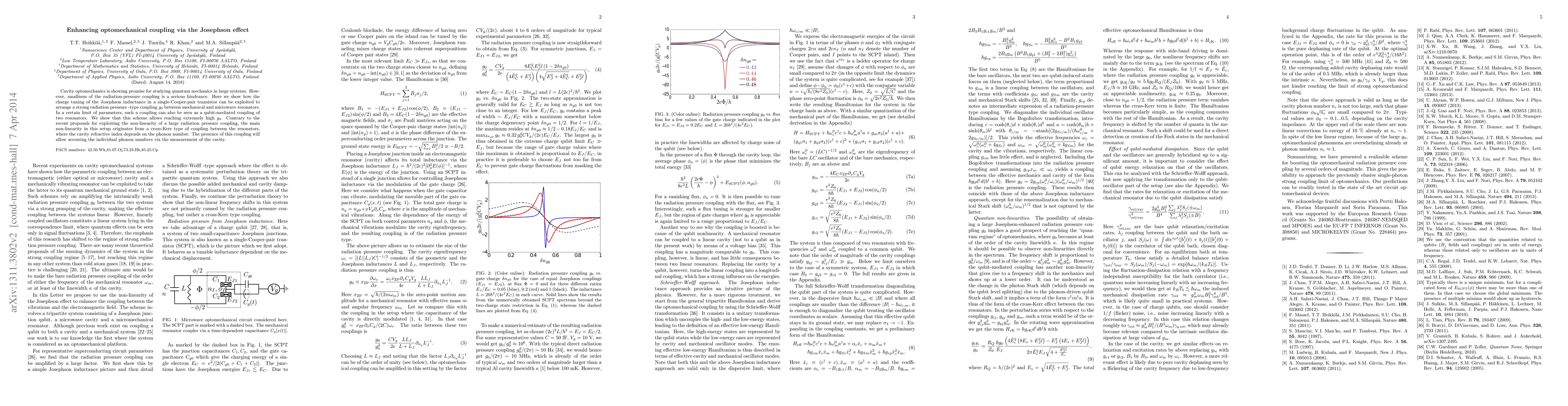 Cavity optomechanics is showing promise for studying quantum mechanics in large systems. However, smallness of the radiation-pressure coupling is a serious hindrance. Here we show how the charge tuning of the Josephson inductance in a single-Cooper-pair transistor (SCPT) can be exploited to arrange a strong radiation pressure -type coupling $g_0$ between mechanical and microwave resonators. In a certain limit of parameters, such a coupling can also be seen as a qubit-mediated coupling of two resonators. We show that this scheme allows reaching extremely high $g_0$. Contrary to the recent proposals for exploiting the non-linearity of a large radiation pressure coupling, the main non-linearity in this setup originates from a cross-Kerr type of coupling between the resonators, where the cavity refractive index depends on the phonon number. The presence of this coupling will allow accessing the individual phonon numbers via the measurement of the cavity.