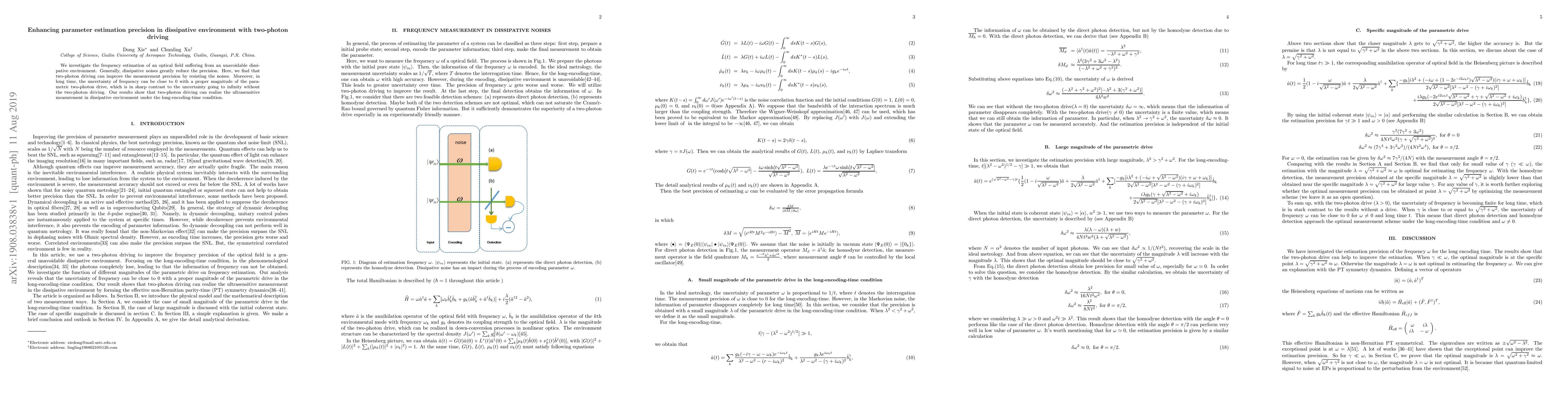 This research demonstrates that two-photon driving can significantly enhance the precision of frequency estimation in optical fields affected by dissipative noise. By effectively countering these noises, the method can achieve near-zero uncertainty in frequency over long measurement times, enabling ultrasensitive measurements in dissipative environments.