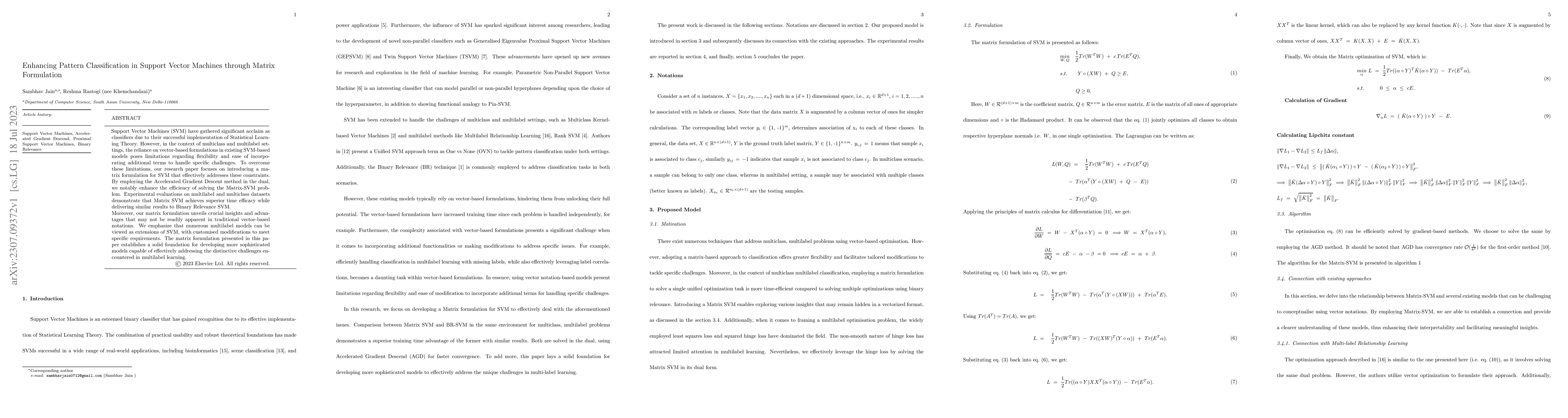 Support Vector Machines (SVM) have gathered significant acclaim as classifiers due to their successful implementation of Statistical Learning Theory. However, in the context of multiclass and multilabel settings, the reliance on vector-based formulations in existing SVM-based models poses limitations regarding flexibility and ease of incorporating additional terms to handle specific challenges. To overcome these limitations, our research paper focuses on introducing a matrix formulation for SVM that effectively addresses these constraints. By employing the Accelerated Gradient Descent method in the dual, we notably enhance the efficiency of solving the Matrix-SVM problem. Experimental evaluations on multilabel and multiclass datasets demonstrate that Matrix SVM achieves superior time efficacy while delivering similar results to Binary Relevance SVM. Moreover, our matrix formulation unveils crucial insights and advantages that may not be readily apparent in traditional vector-based notations. We emphasize that numerous multilabel models can be viewed as extensions of SVM, with customised modifications to meet specific requirements. The matrix formulation presented in this paper establishes a solid foundation for developing more sophisticated models capable of effectively addressing the distinctive challenges encountered in multilabel learning.