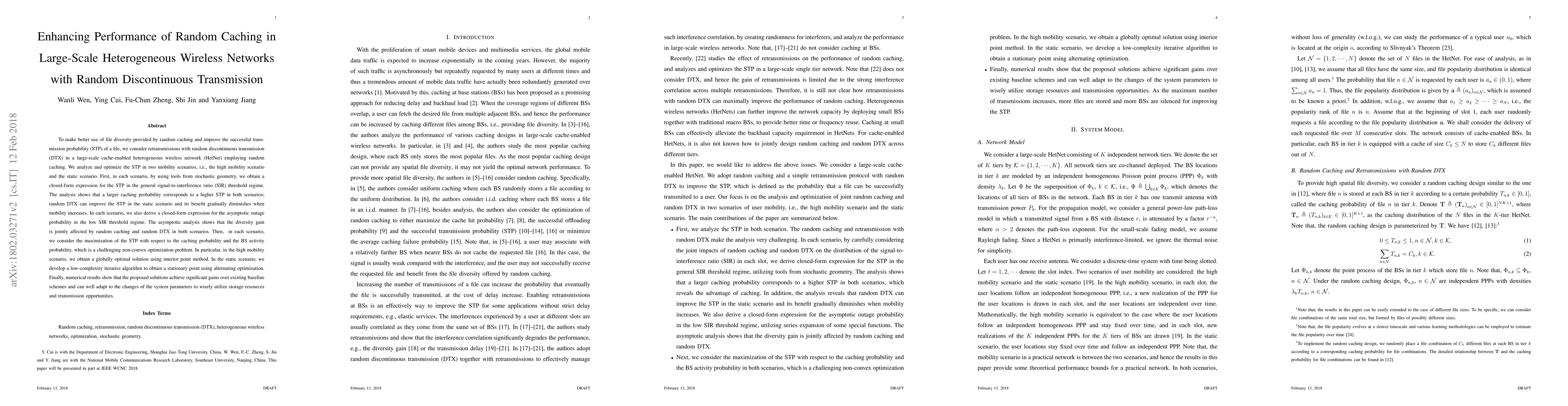 This paper enhances the performance of random caching in large-scale heterogeneous wireless networks by employing random discontinuous transmission (DTX) to improve successful transmission probability (STP). It analyzes and optimizes STP under high mobility and static scenarios, deriving closed-form expressions and developing optimization algorithms to maximize STP with respect to caching and base station activity probabilities.